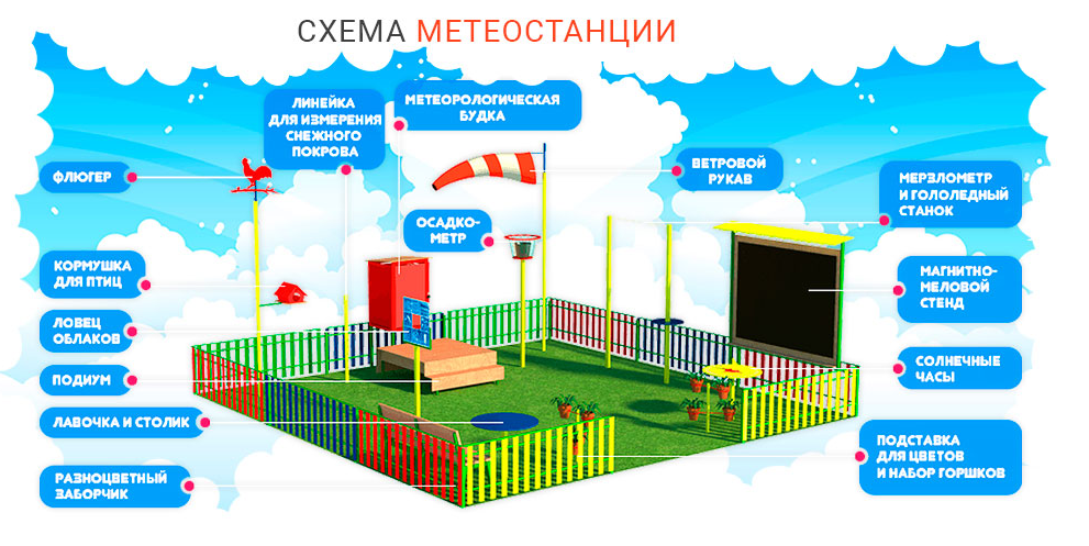 Метеоплощадка представляет собой определенный участок местности, находящийся на участке детского сада, с установленным метеорологическим оборудованием для прогнозирования погоды.