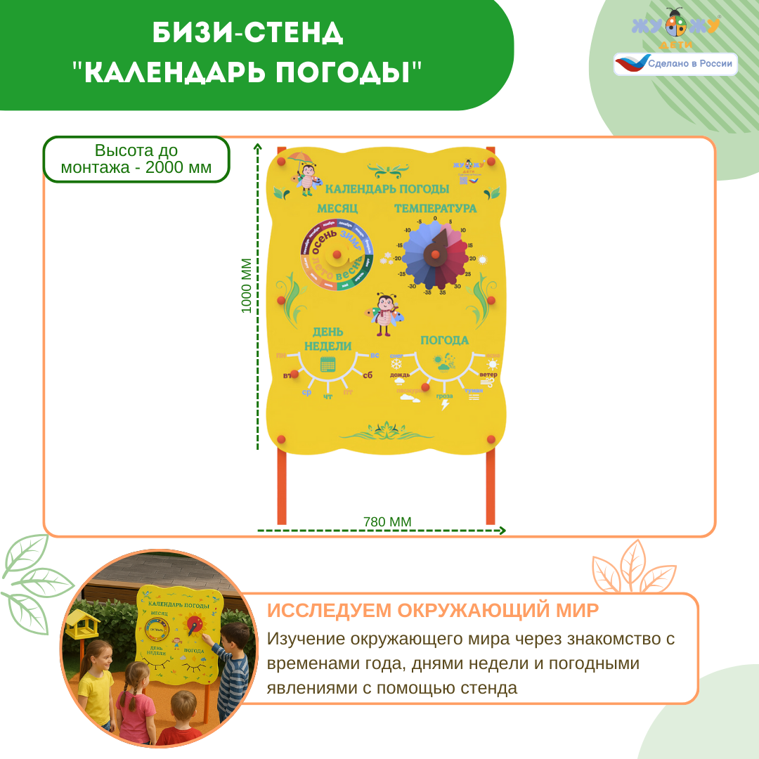 Познакомит со временами года, днями недели, видами погодных условий! На стенде расположено множество бизи-элементов, которые можно вращать, передвигать, тем самым у ребенка развивается мелкая моторика.