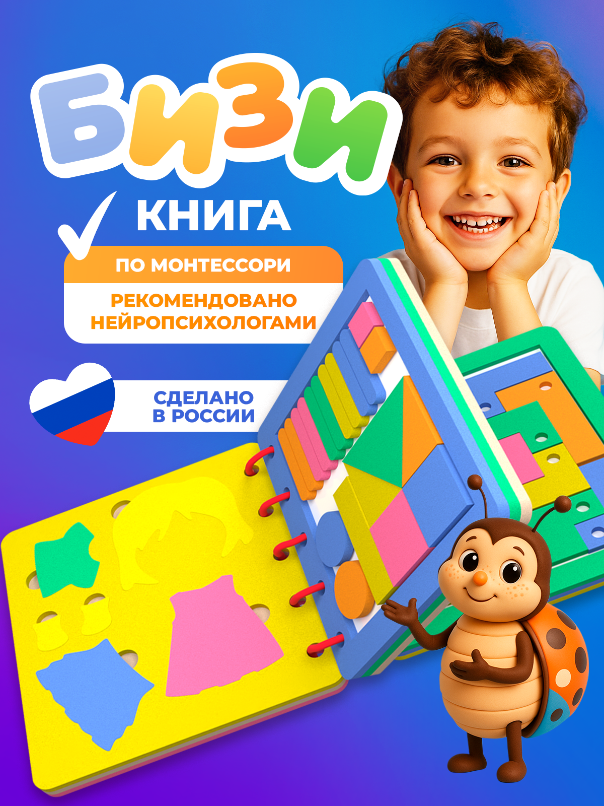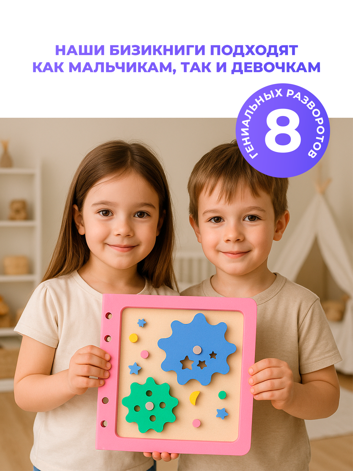 "Бизикнига для малышей — это увлекательный мир развивающих игр с пальчиковым лабиринтом, съемными элементами, магнитным тетрисом, счетным материалом и крутящимися шестеренками, которые тренируют мелкую моторику, логику и воображение!