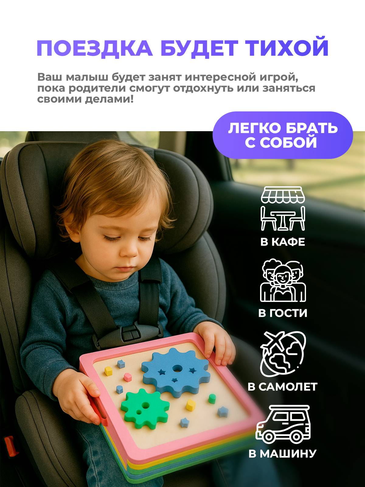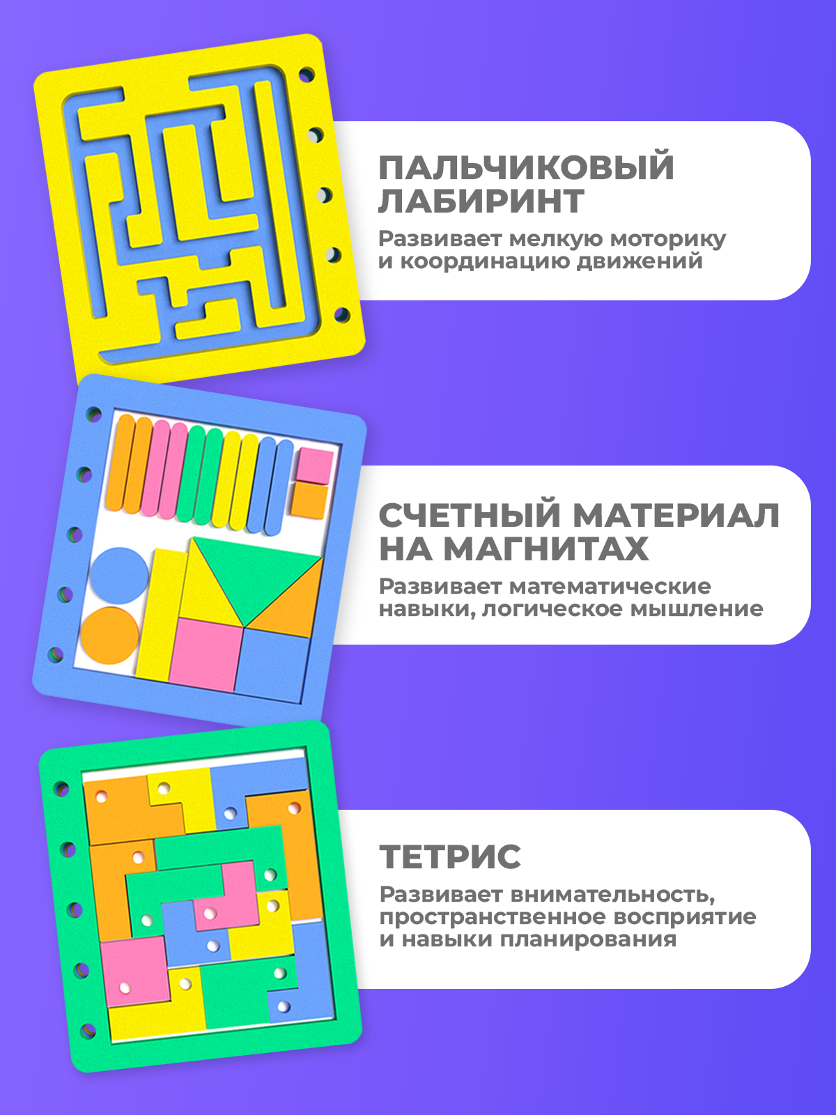 5 интерактивных зон — лабиринт, съёмные элементы, магнитный тетрис, счётный материал и шестерёнки для долгой увлекательной игры.