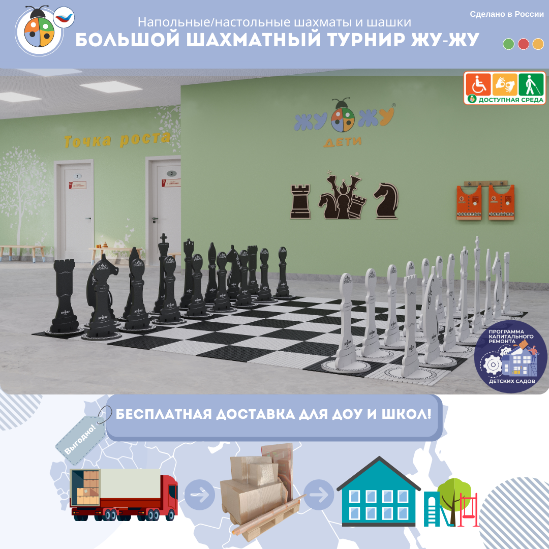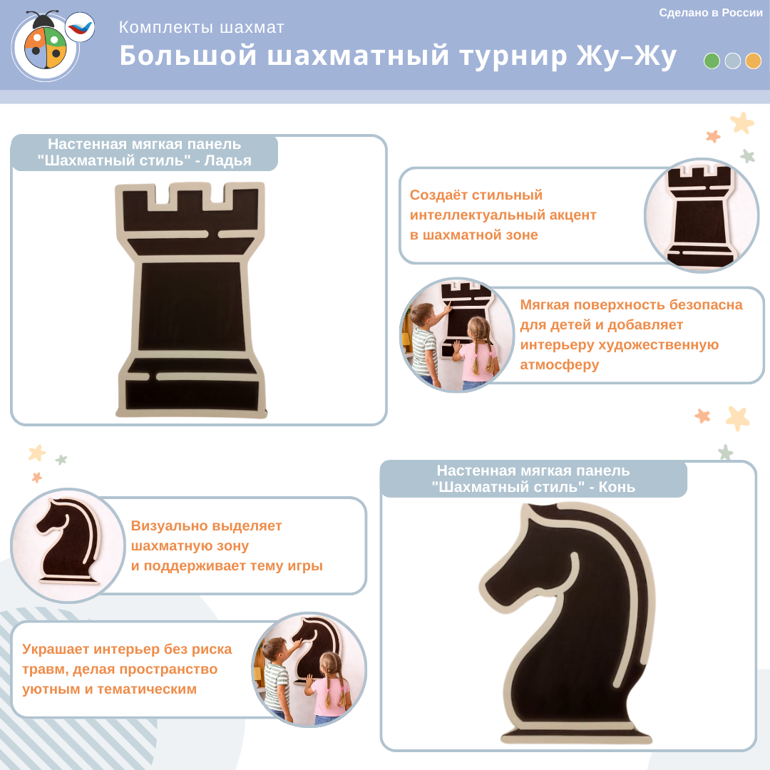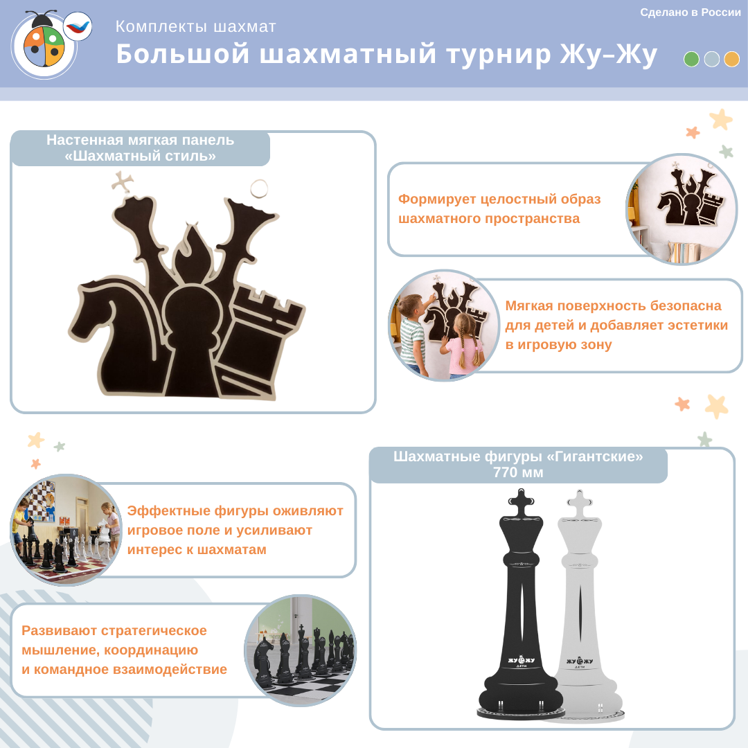 Комплект для организации яркой шахматной зоны в просторных помещениях. Гигантские фигуры и большое поле создают эффект настоящего турнира, а настенное оформление и жилеты усиливают игровую и ролевую составляющую. Подходит для проведения соревнований, праздников и тематических событий. Формирует визуально сильное и запоминающееся пространство.