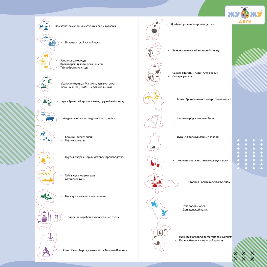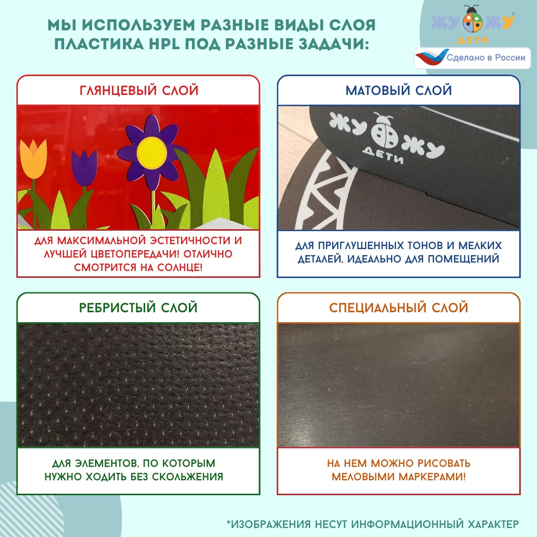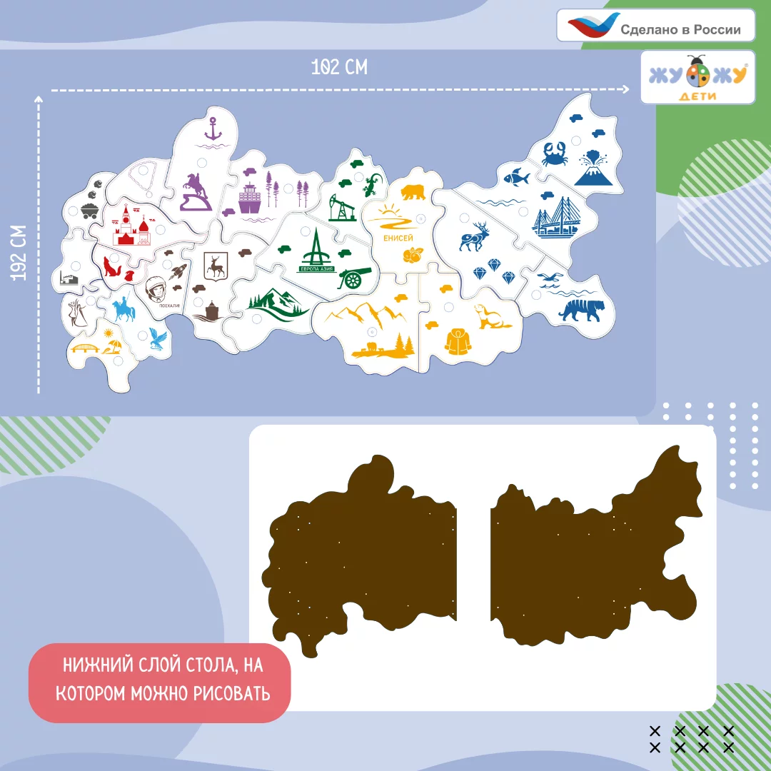 Детский развивающий стол-пазлы в виде карты России состоит из 2 слоев. Первый слой выполнен из специального материала, на котором можно рисовать мелом. На этом слое расположены подсказки по регионам, без нарисованных границ. Вы можете рисовать или выкладывать ассоциации с каждым регионом, например, выложить шишки, найденные на территории, на регион тайги, а для приморских регионов принести игрушечный корабль. Так, пазлы легкие и тактильно приятные для детей - они могут быть использованы отдельно, как в помещении, так и на улице. А значит, Вы можете продолжить занятие и собрать пазл прямо в классе!
