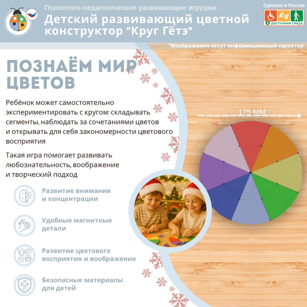 Детский развивающий цветной конструктор "Круг Гёте" основан на теории цвета Гёте, что позволяет детям изучать основные и дополнительные цвета, а также их сочетания.
