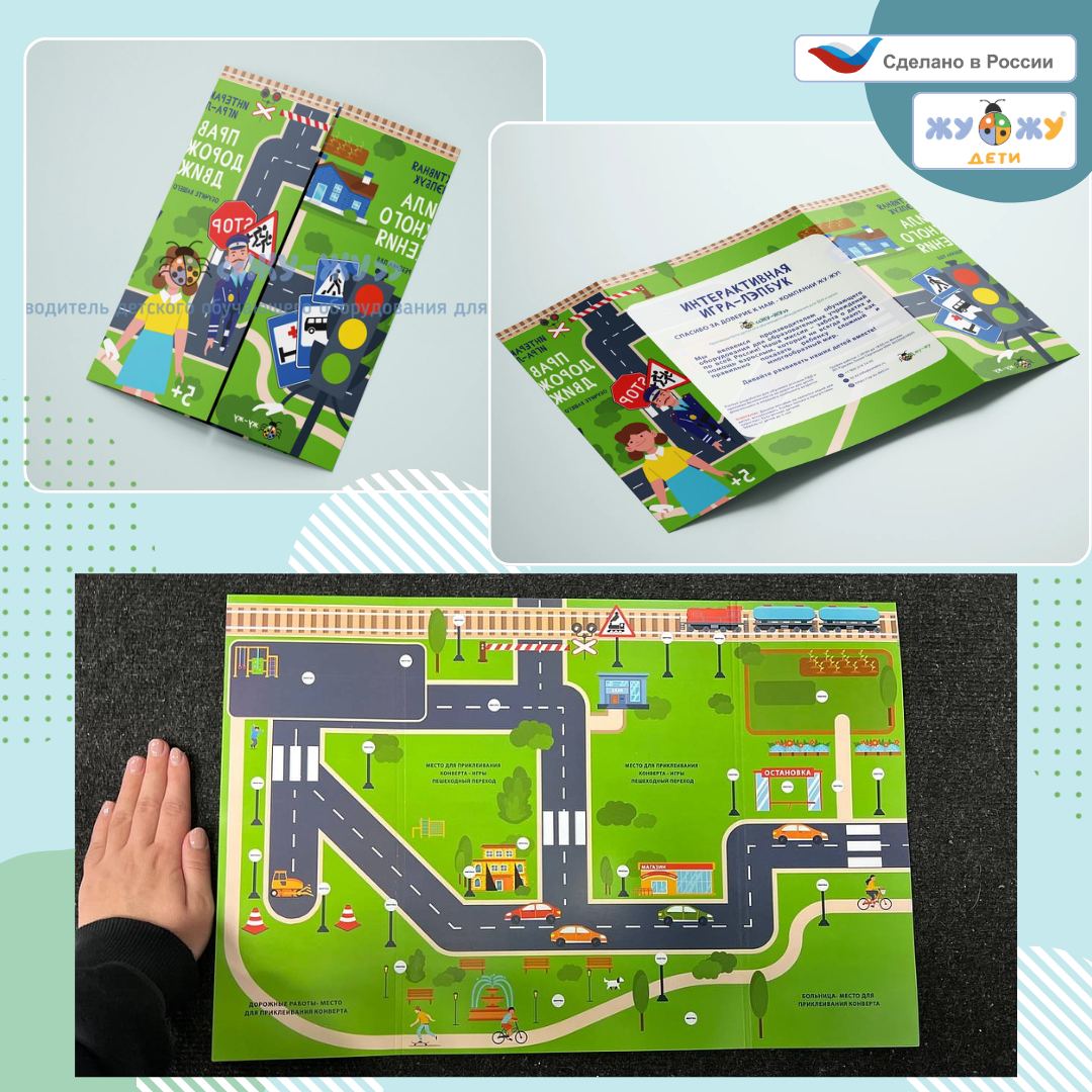 Лэпбук точно заинтересует детей, ведь это необычная книжка! В лэпбук входит множество элементов. Элементы на клее: конвертики. Элементы на липучках: здания, машинки, человечки, знаки, деревья. Элементы-вкладыши: визитки. Цель игры - добраться до определенного места не нарушая правил дорожного движения.