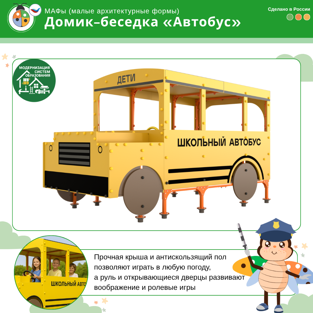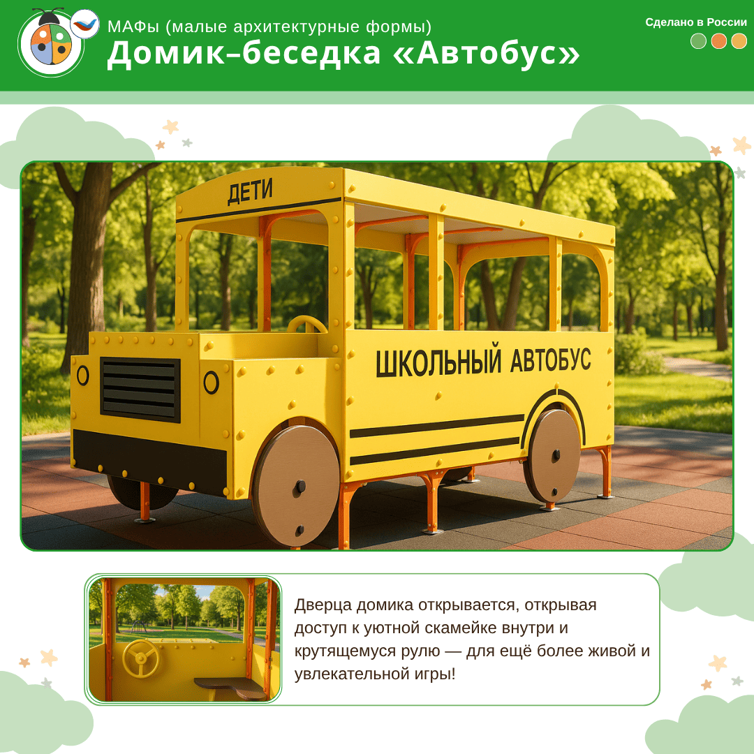 Домик-беседка "Автобус" — это многофункциональная игровая зона с бизи-элементами, где дети могут почувствовать себя водителями, укрыться от солнца и дождя под надежной крышей, безопасно играть на антискользящем полу, отдыхать на лавочке и развивать фантазию!