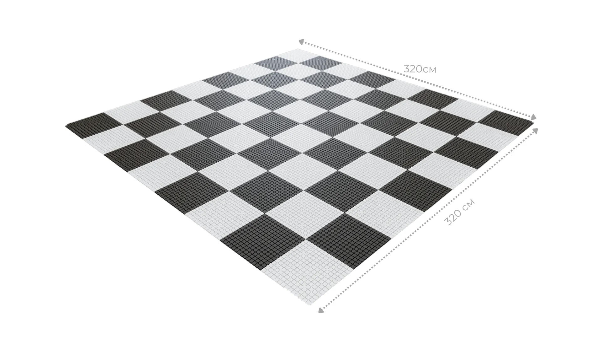 Поле (Длина х Ширина) 3,2 х 3,2 метра. Размер одной клетки — 40 см. Состоит из 64 клеток весом 20 кг. Вес одной клетки — 313 грамм.