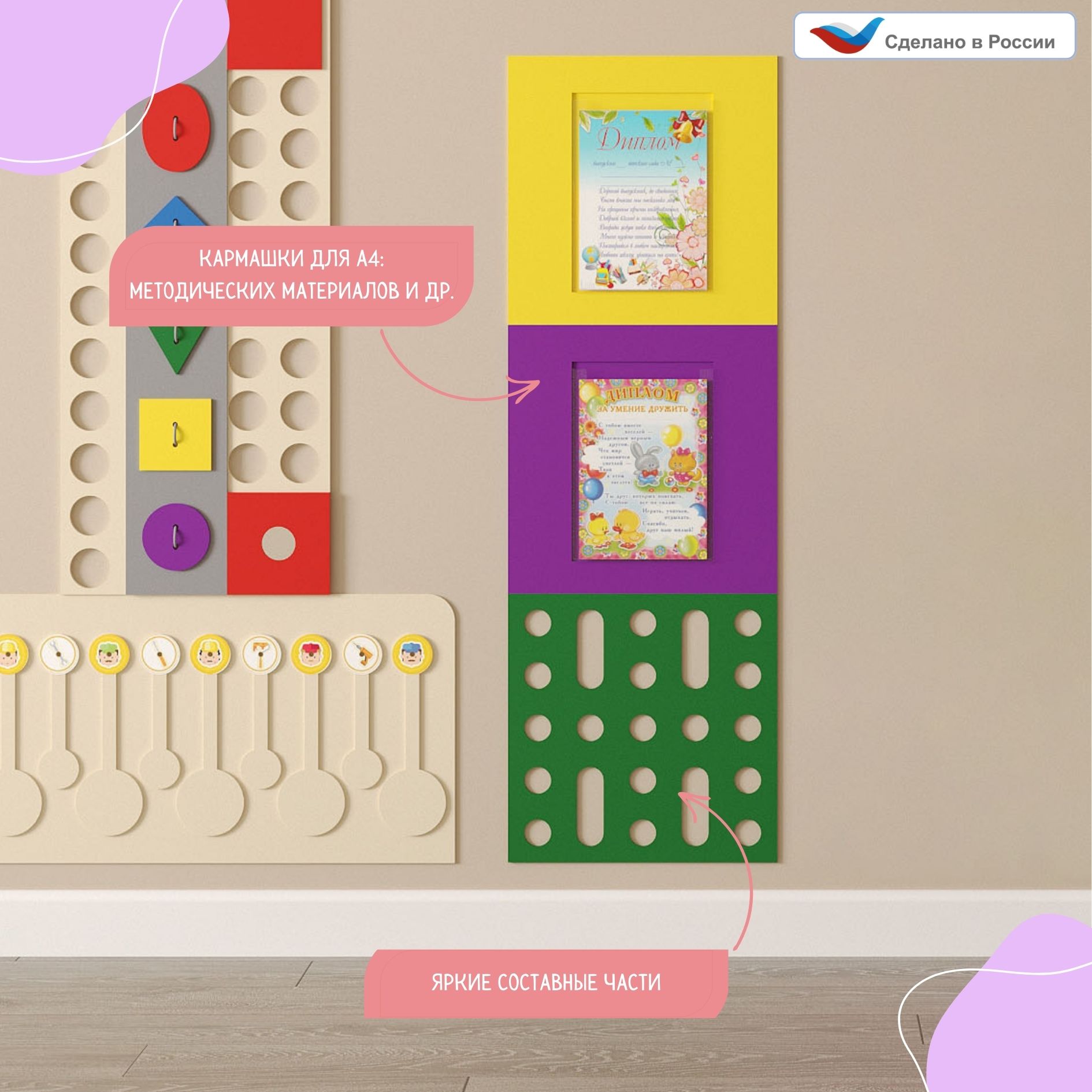 Панель предназначена для зонирования пространства и оформления групп в ДОО или специализированных детских учреждениях.