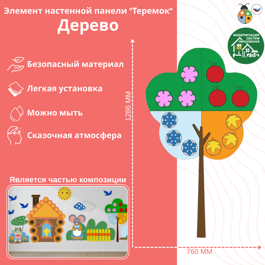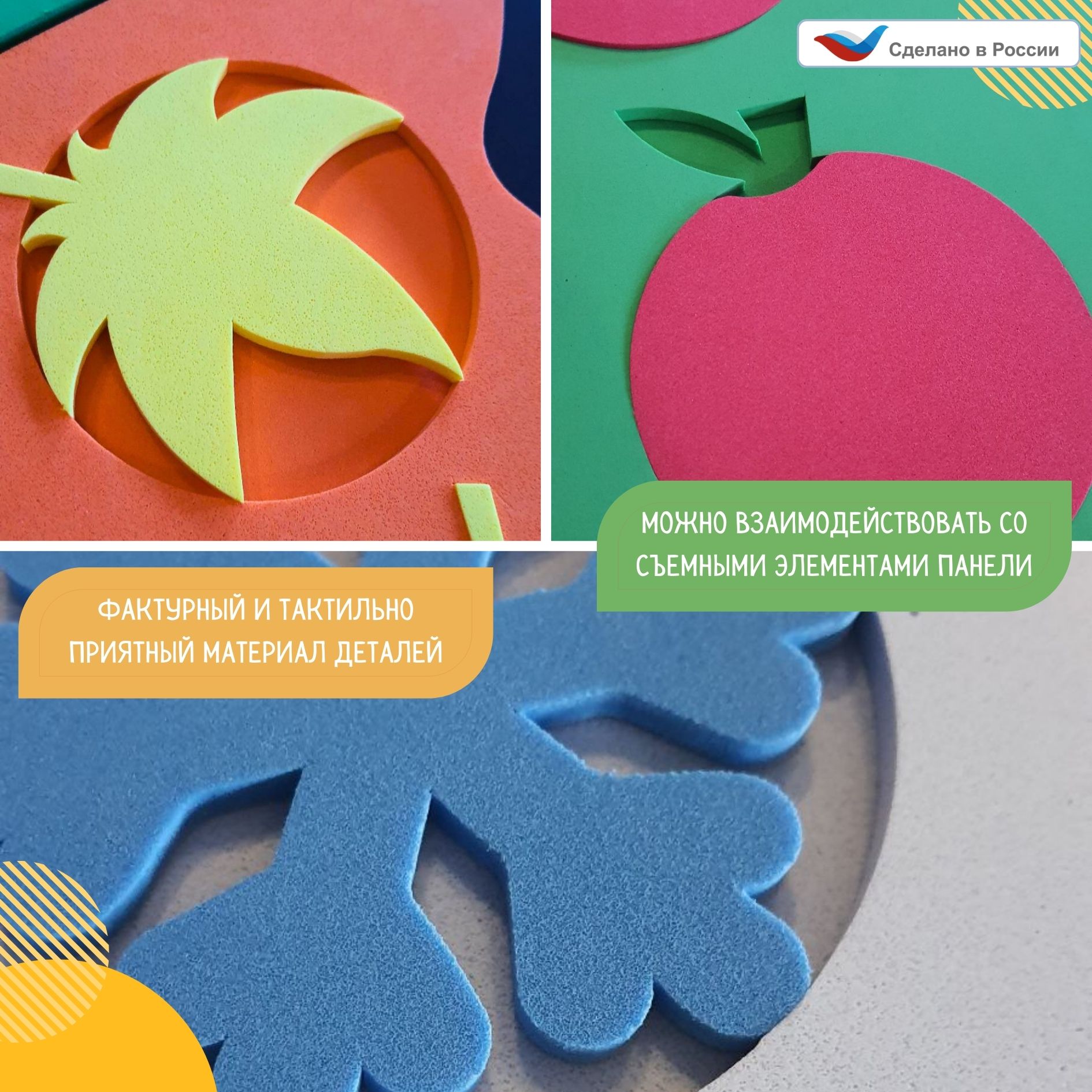 Панель предназначена для зонирования пространства и оформления групп в ДОО или специализированных детских учреждениях. Съемные элементы: яблоки, снежинки, цветы, листья.