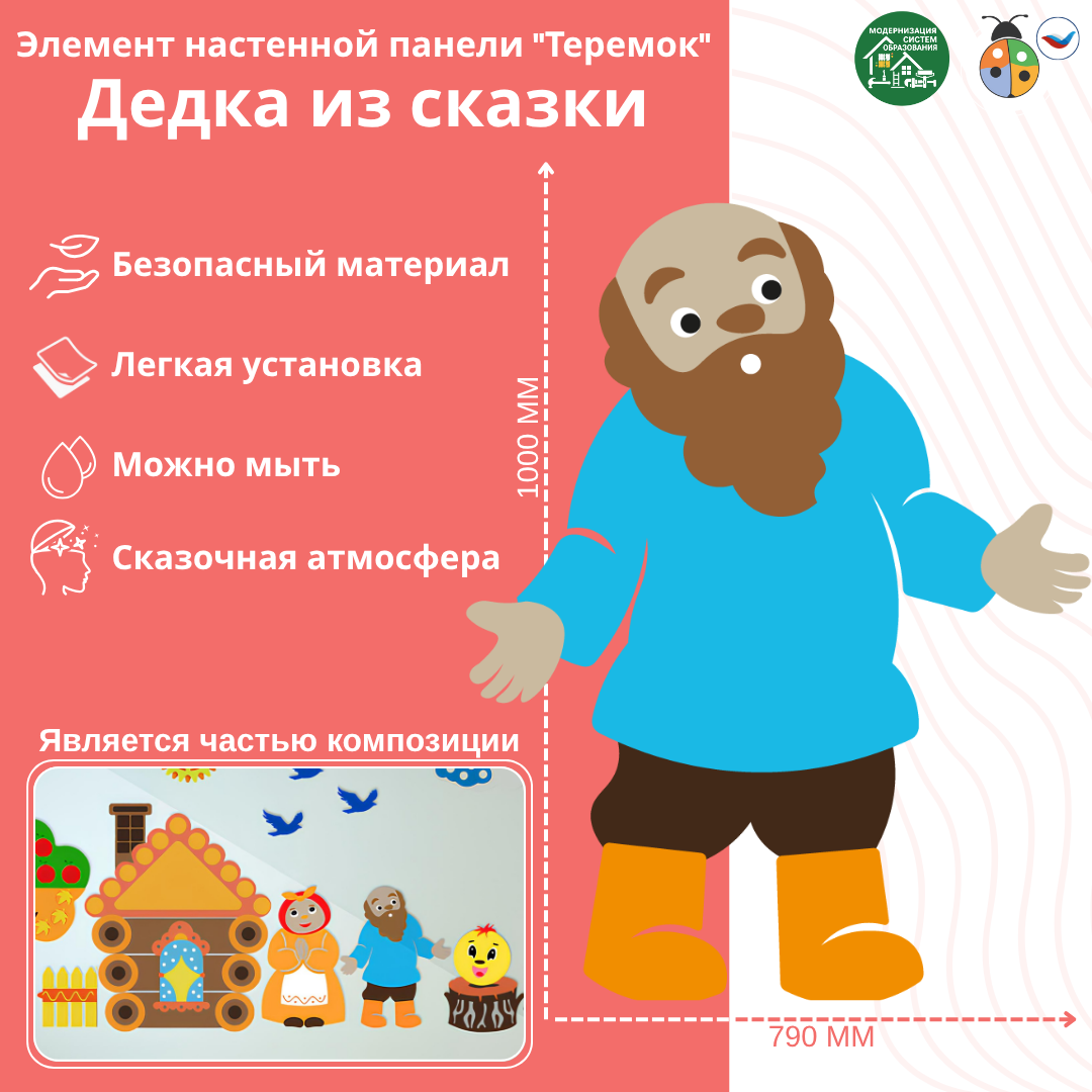 Элемент настенной панели "Дедка из сказки", выполненный из мягкого пластика, представляет собой забавную и детализированную фигурку дедушки. Дедка изображен в удивленном виде, с широко разведенными в стороны руками, что придает ему динамичность и выразительность. Дедка одет в традиционную одежду, в рубаху и штаны, что подчеркивает его народный образ. Цвета панели яркие и насыщенные, что привлекает внимание и создает атмосферу сказки. Этот элемент идеально подходит для украшения детской комнаты, создавая уют и стимулируя воображение ребенка.