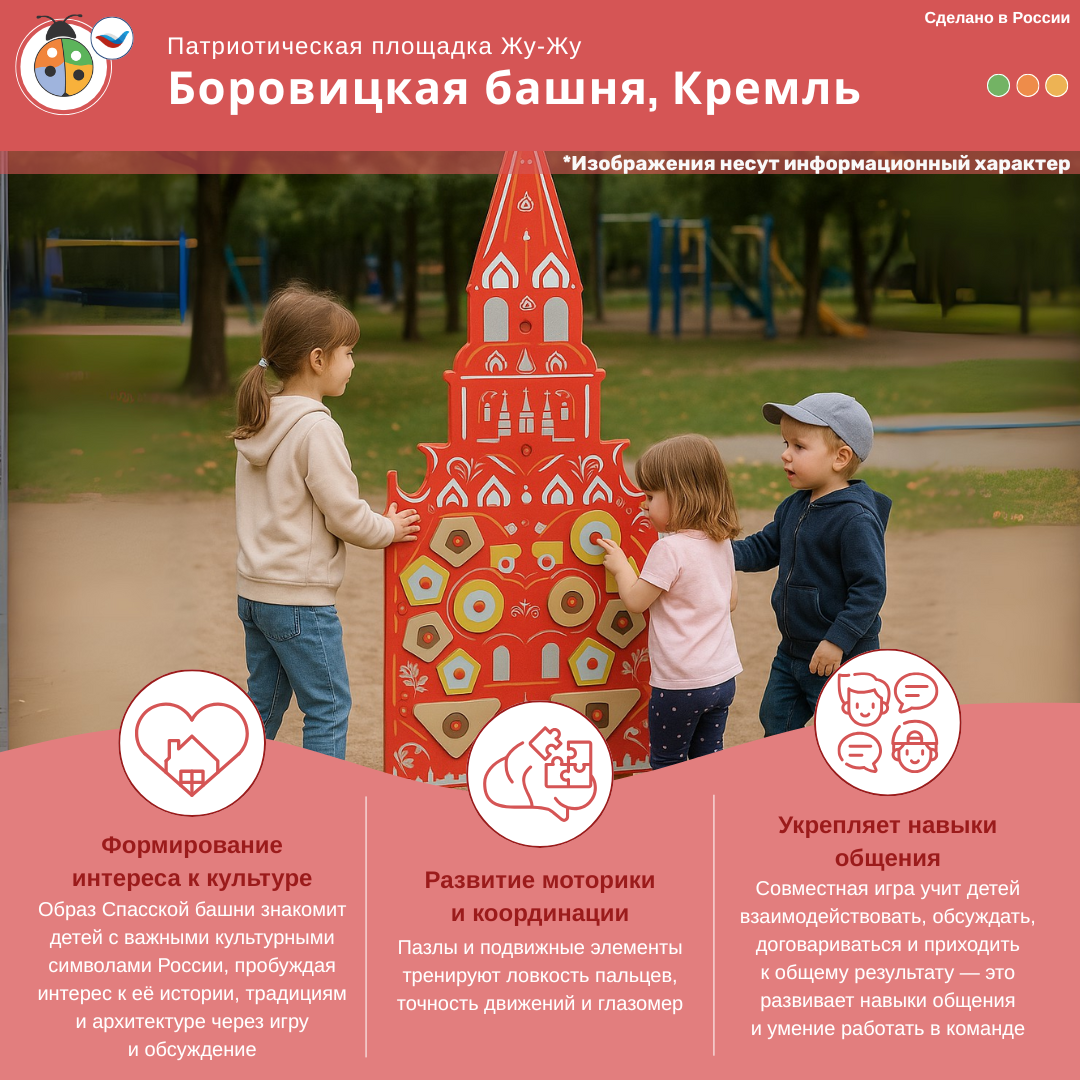 Элемент патриотической площадки "Жу-Жу" в виде Боровицкой башни Кремля не только развивает различные навыки у детей, но и вдохновляет их на изучение истории и культуры, делая процесс обучения увлекательным и интерактивным.