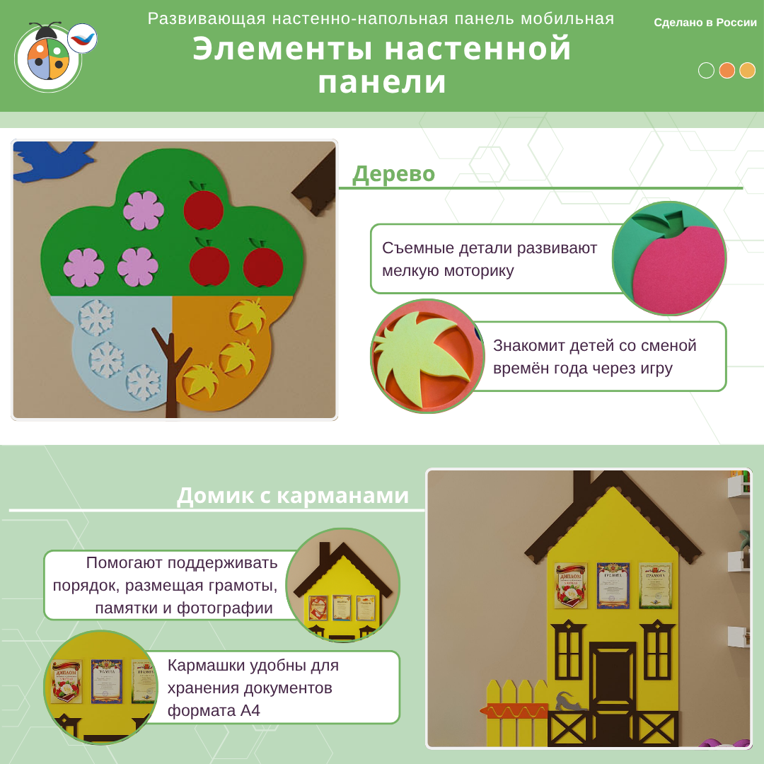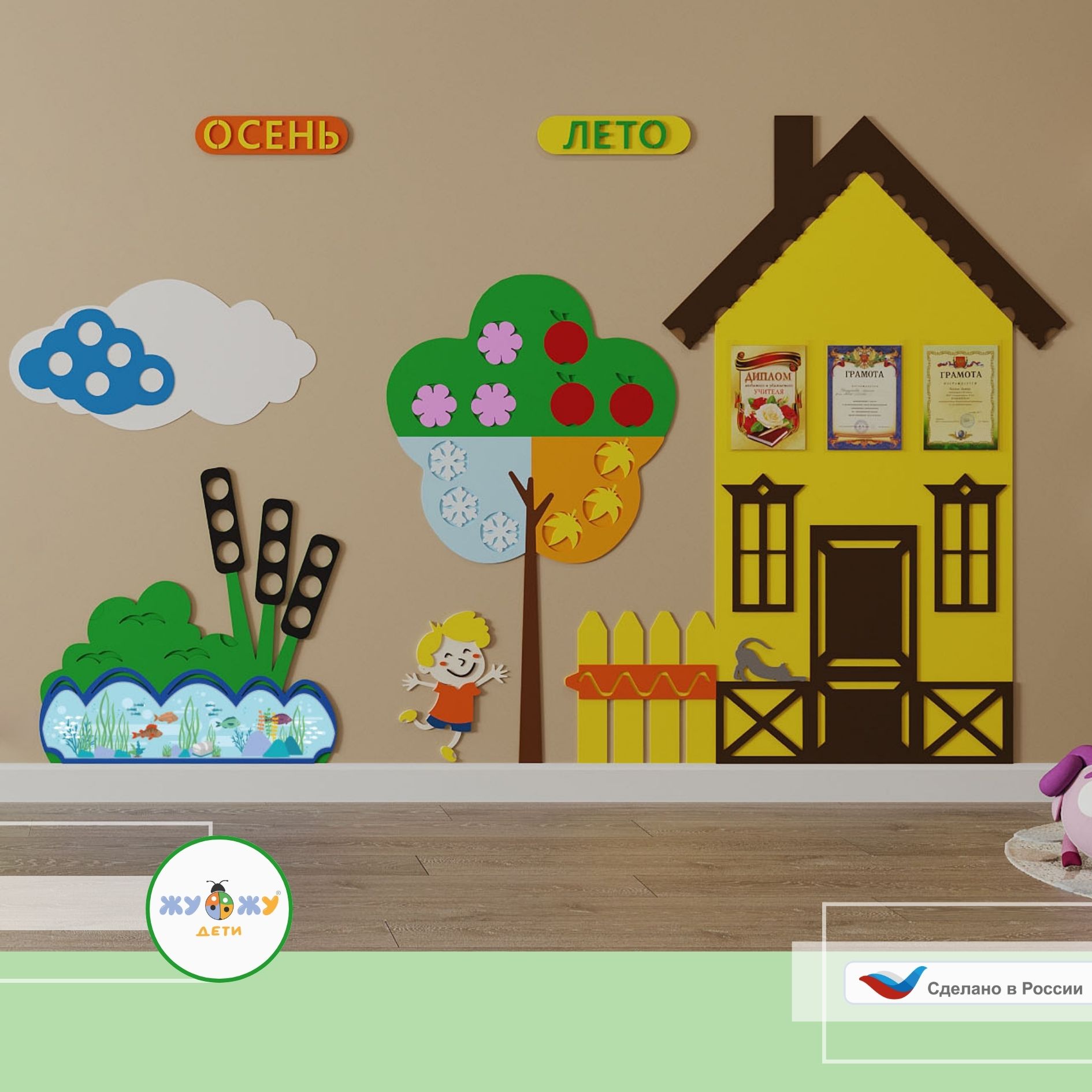 Игровая настенная панель предназначена для зонирования пространства и оформления групп в ДОО или специализированных детских учреждениях. На панели расположены съемные элементы, кармашки для методических материалов, пальчиковый лабиринт. Игра с настенной панелью развивает мелкую моторику, знакомит с особенностями времен года.