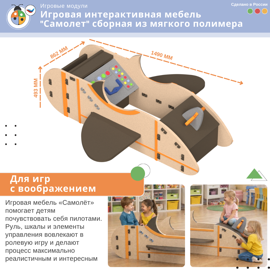 Интерактивный игровой самолет из мягкого полимера с бизи-элементами (руль, шкалы высоты и скорости) развивает моторику и воображение, легко собирается как конструктор, обеспечивая безопасность и удобство хранения