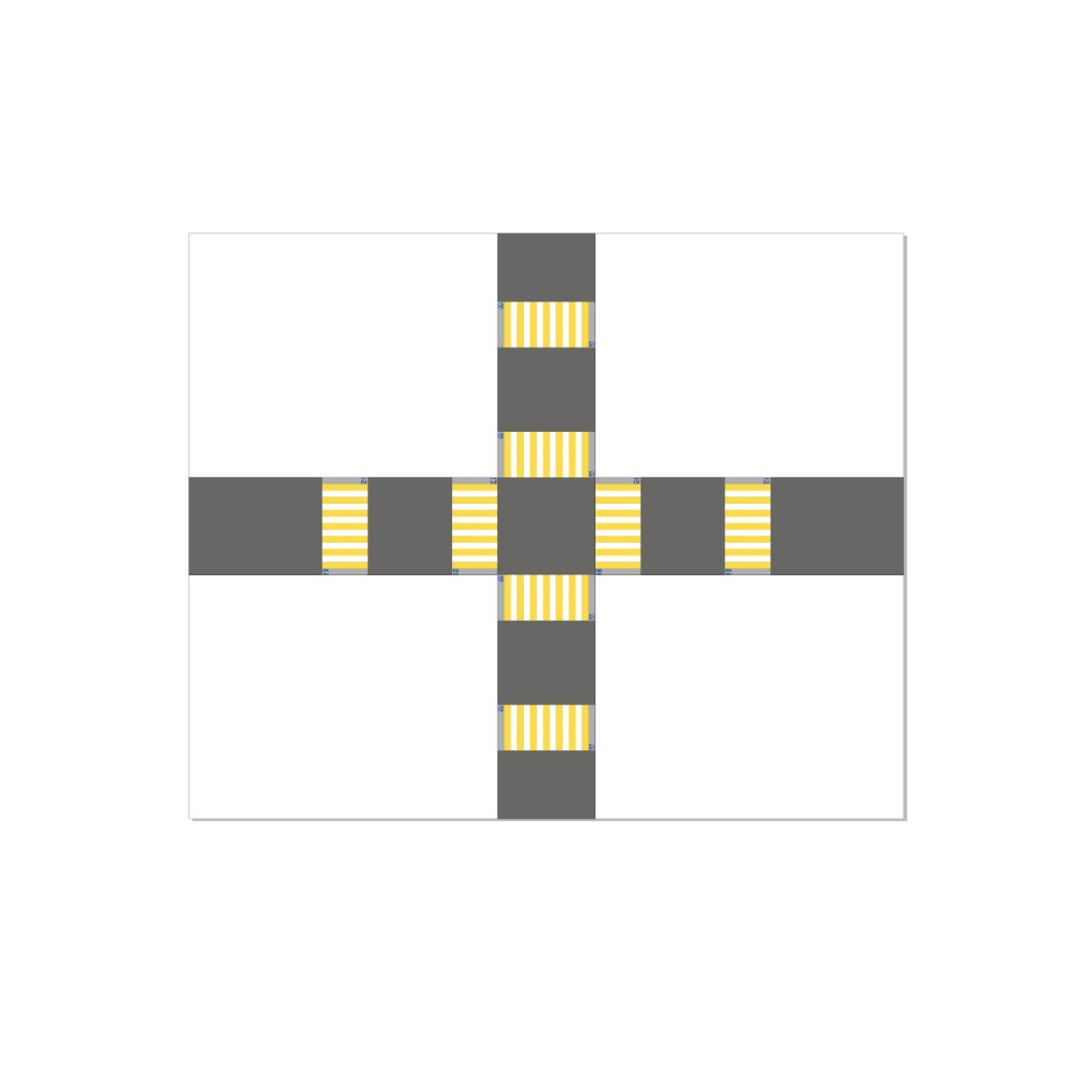 Баннер представляет собой 2 полотна, накладывающихся перпендикулярно друг другу. Позволяет создавать различные дорожные ситуации, подходит для большого комплекта автогородка. Легко собирается и убирается. Опытным путем мы подобрали идеальный размер имитации дорожной части: баннер идеально подходит для помещений, не создавая скученности расположенных на нем элементов.