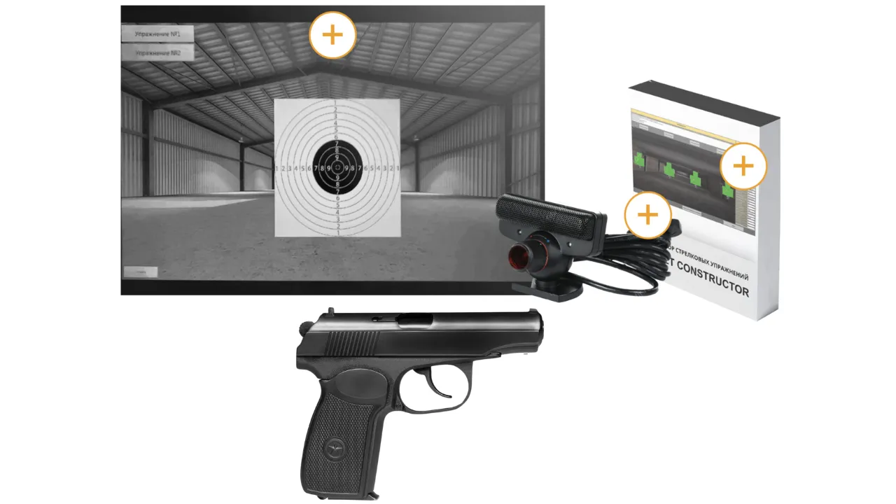 - Дальность от стрелка до экрана – не более 5 м, дальность от проектора и камеры до экрана - 3 м. Эквивалентная дальность до мишени определяется пользователем в настройках каждой мишени индивидуально.