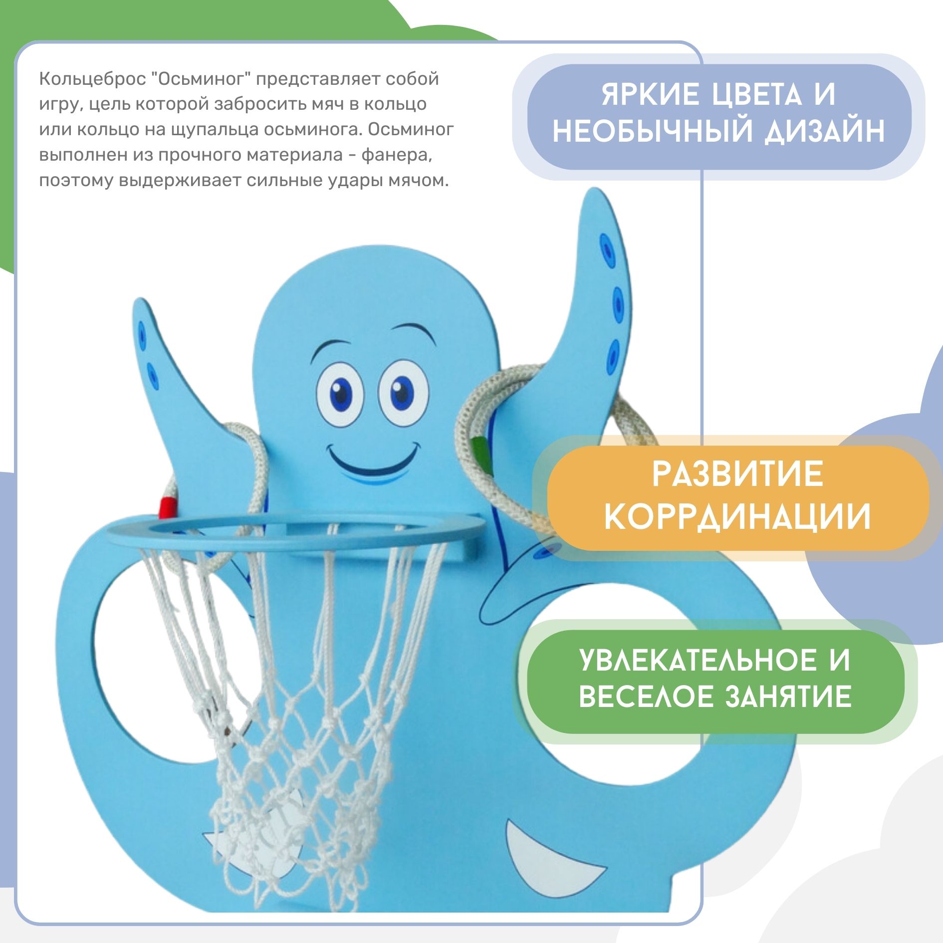 Кольцеброс "Осьминог" представляет собой игру, цель которой забросить мяч в кольцо или кольцо на щупальца осьминога. Осьминог выполнен из прочного материала - фанера, поэтому выдерживает сильные удары мячом. Игра крепится к стене.