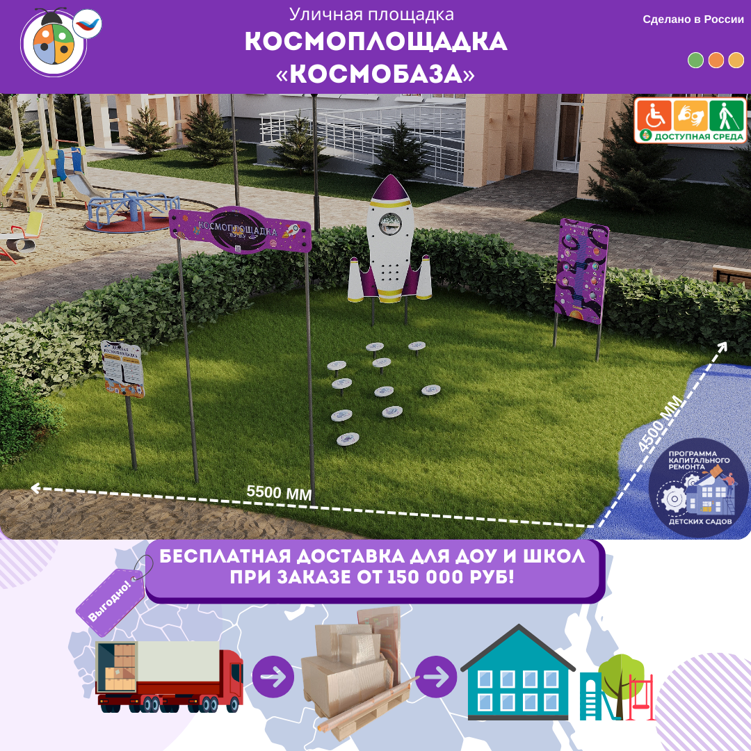 Уличные площадки (метеостанции, музыкальные, патриотические площадки) мы доставляем бесплатно при сумме договора от 150 000 рублей до адреса Покупателя по всей РФ. Остальные индивидуальные комплекты доставляем за счет Покупателя, включая в стоимость договора.