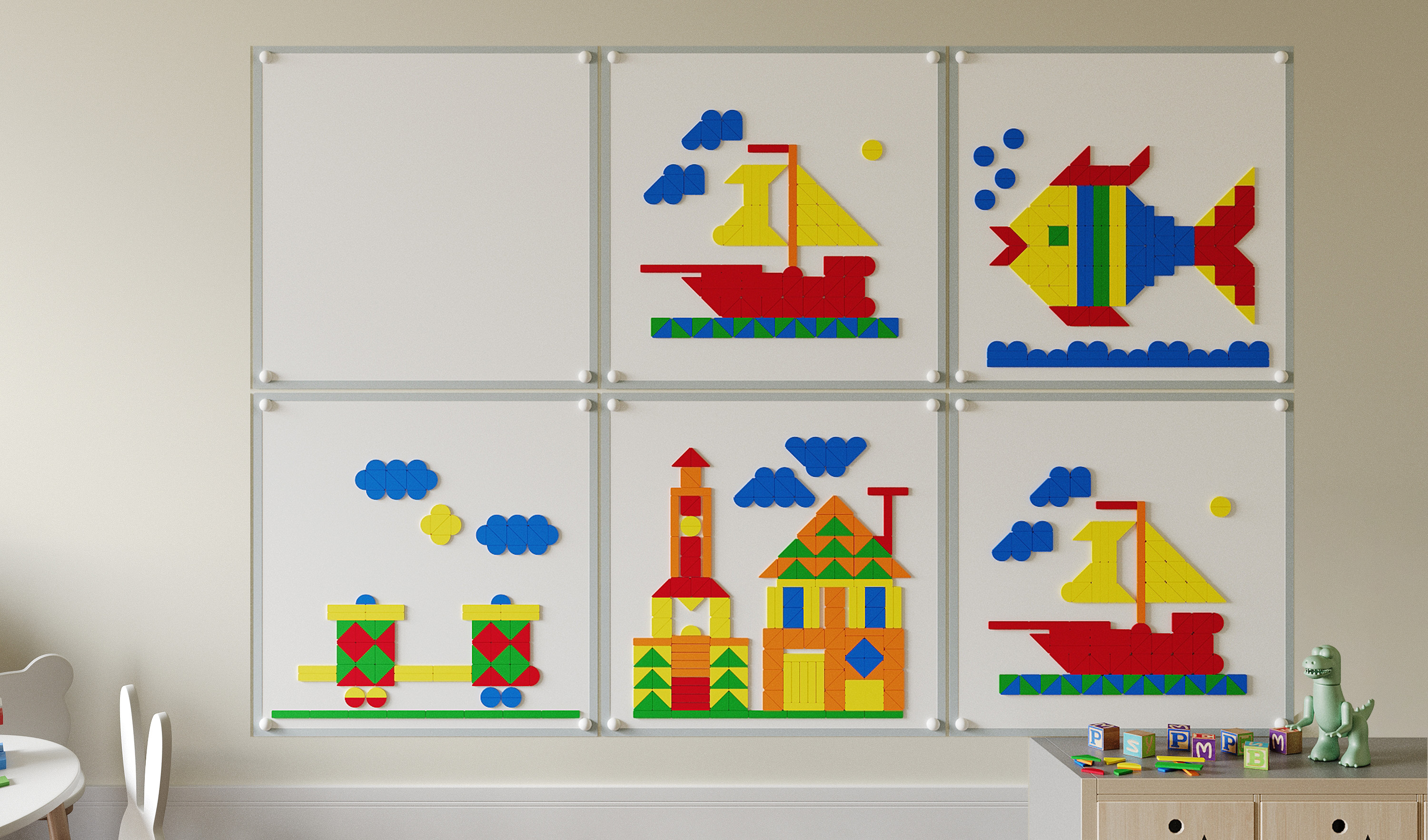 Комплект мозаики состоит из 450 шт. геометрических фигур: треугольники, прямоугольники и полукруги (5 вариантов цвета). Устанавливайте фигуры с магнитами на металлические панели. Конечная фигура зависит только от фантазии игроков!.