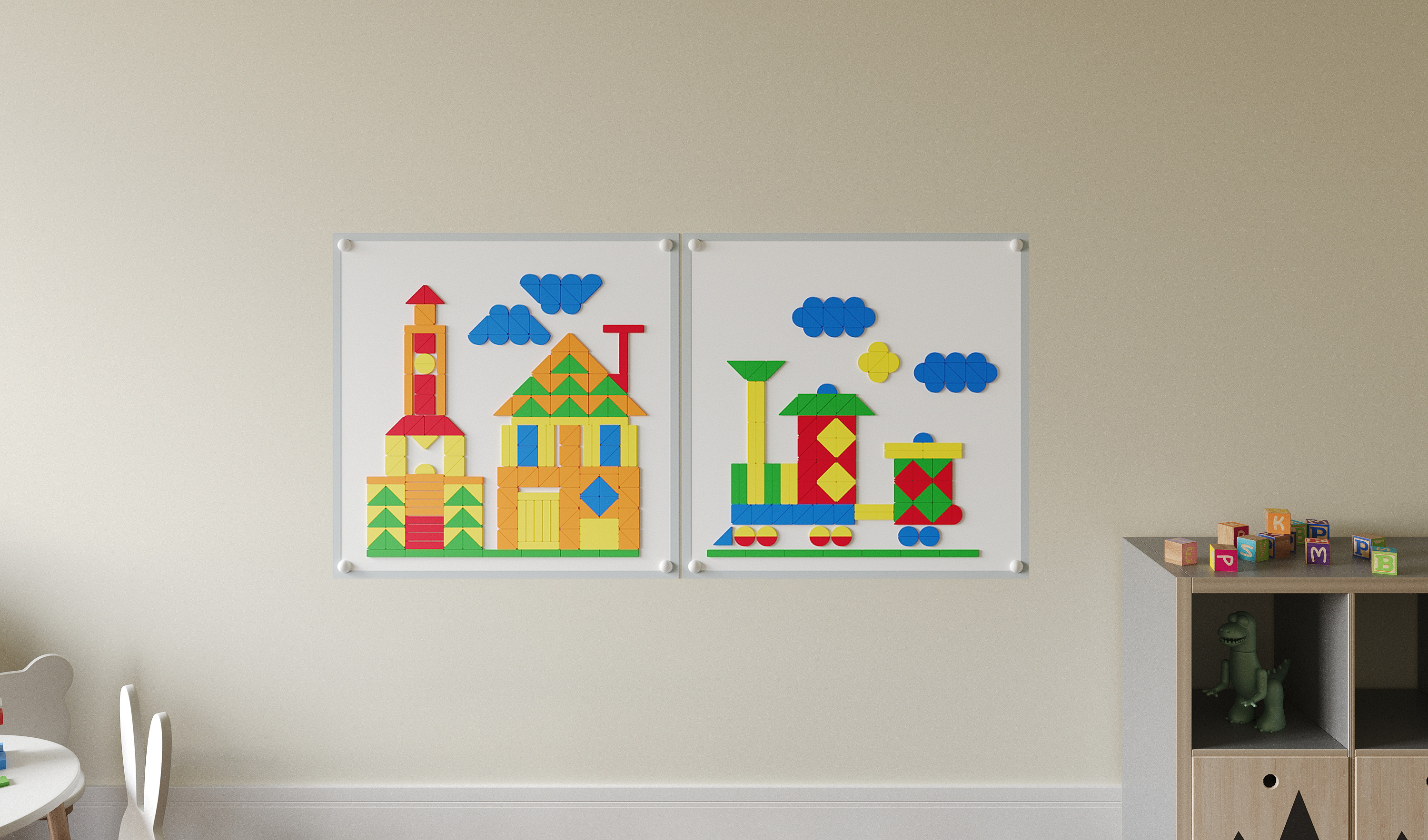 Комплект мозаики состоит из 150 шт. геометрических фигур: треугольники, прямоугольники и полукруги (5 вариантов цвета). Устанавливайте фигуры с магнитами на металлические панели. Конечная фигура зависит только от фантазии игроков!.