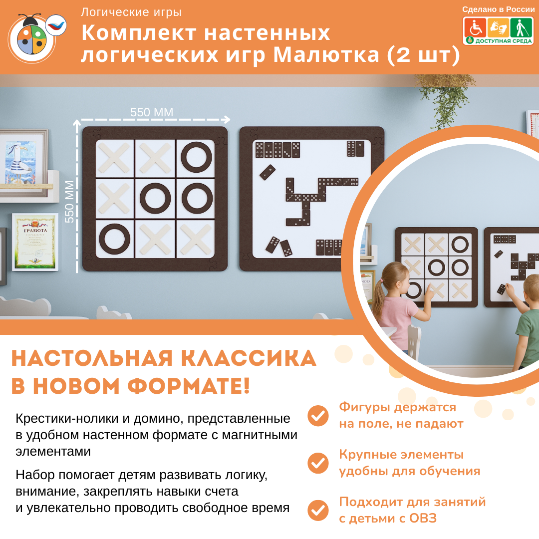 Комплект настенных логических игр Малютка (2 шт) предназначен для детей дошкольного и школьного возраста. Состоит из всеми известных игр: крестики-нолики и домино. Выполнен из экологически чистых материалов и безопасен для детей.