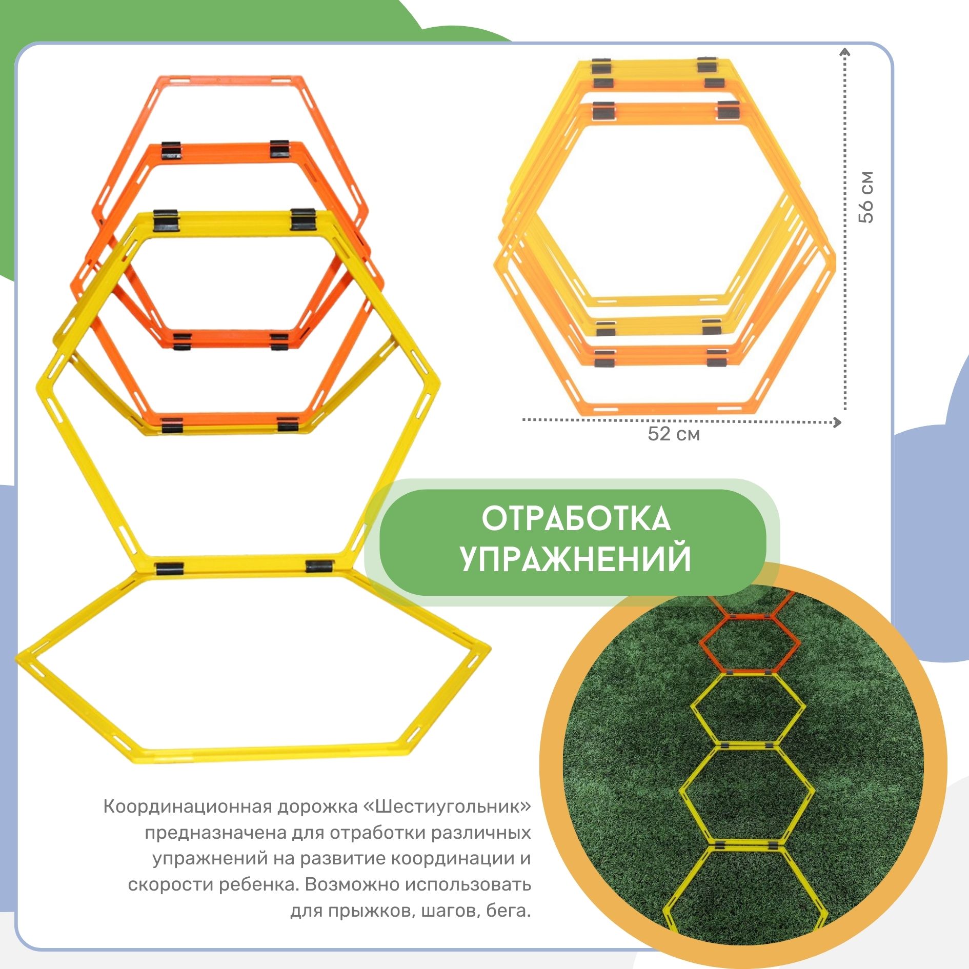 Координационная дорожка «Шестиугольник» предназначена для отработки различных упражнений на развитие координации и скорости ребенка. Возможно использовать для прыжков, шагов, бега.