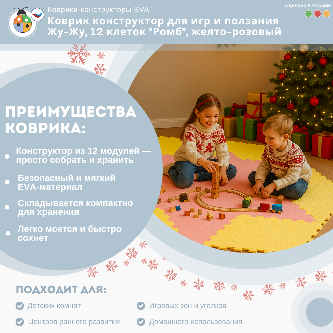 Коврик конструктор для игр и ползания Жу-Жу, 12 клеток "Ромб", желто-розовый — это отличный выбор для создания безопасной и комфортной игровой зоны для малышей. Такой коврик обеспечивает мягкую поверхность для игр и ползания, а также добавляет стильный акцент в интерьер детской комнаты.