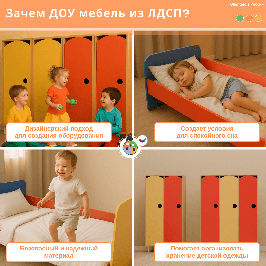 3. Яркий и позитивный дизайн – сочные цвета создают добрую атмосферу, нравятся детям и гармонично вписываются в интерьер детской группы.
