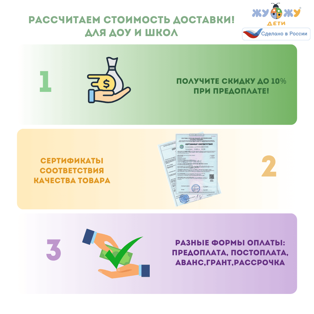Настенные элементы (панели, мозаику, логические игры) мы доставляем бесплатно до адреса Покупателя по всей РФ при сумме договора от 50 000 рублей. При доставке до адреса Покупателя комплектов стоимостью ниже 50 000 рублей включаем стоимость доставки в сумму договора.