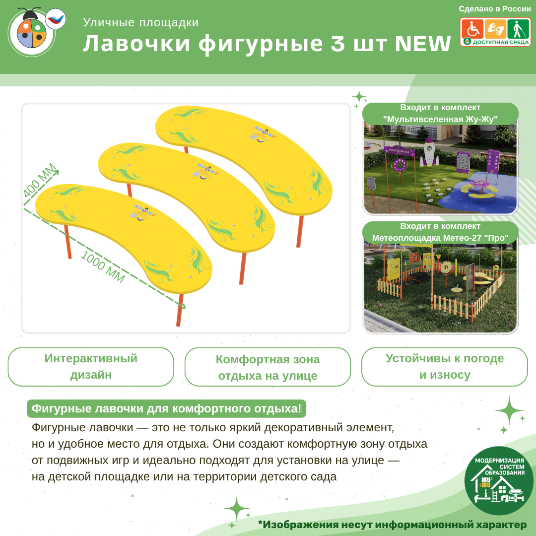 Лавочки в форме лепестков отлично сочетаются со столиком в форме ромашки "Любит-не любит". На лавочках можно отдохнуть после подвижных игр. Лавочки выполнены из влагостойкой фанеры и им не страшны любые погодные явления!