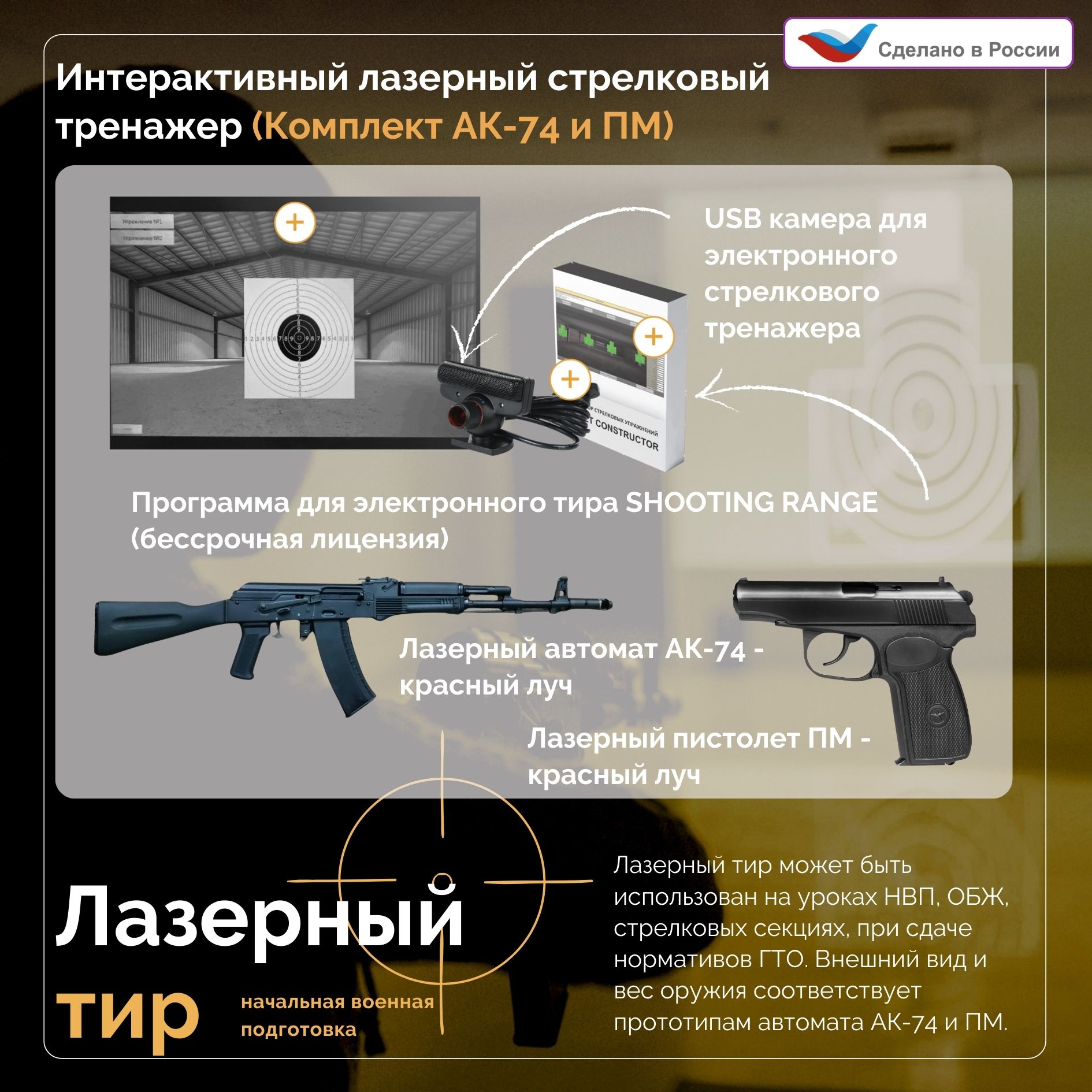 Лазерный тир может быть использован на уроках НВП, ОБЖ, стрелковых секциях, при сдаче нормативов ГТО. Внешний вид и вес оружия соответствует своему прототипу ПМ и автомату АК. Тренажер рассчитан преимущественно на новичков, детей/подростков, поэтому полностью безопасен в использовании. Предупреждение: Оружие нельзя разбирать!