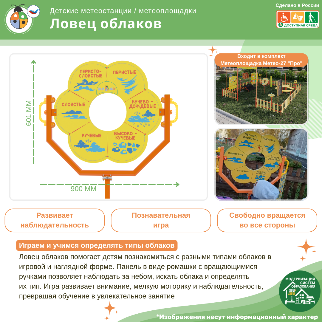 Ловец облаков представляет собой панель в форме ромашки с ручками на неподвижной платформе, которую можно наклонить вперед или назад, повернуть вправо-влево. В середине панели есть окошко, через которое ребенок находит понравившееся облако на небе и определяет его тип по 6-ти представленным на панели.
