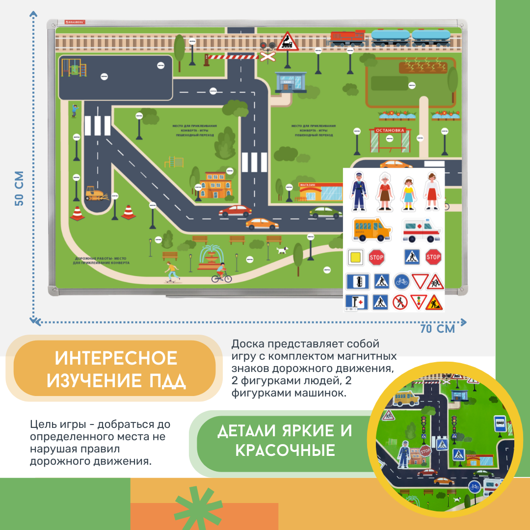 Доска представляет собой игру с комплектом магнитных знаков дорожного движения, 2 фигурками людей, 2 фигурками машинок.