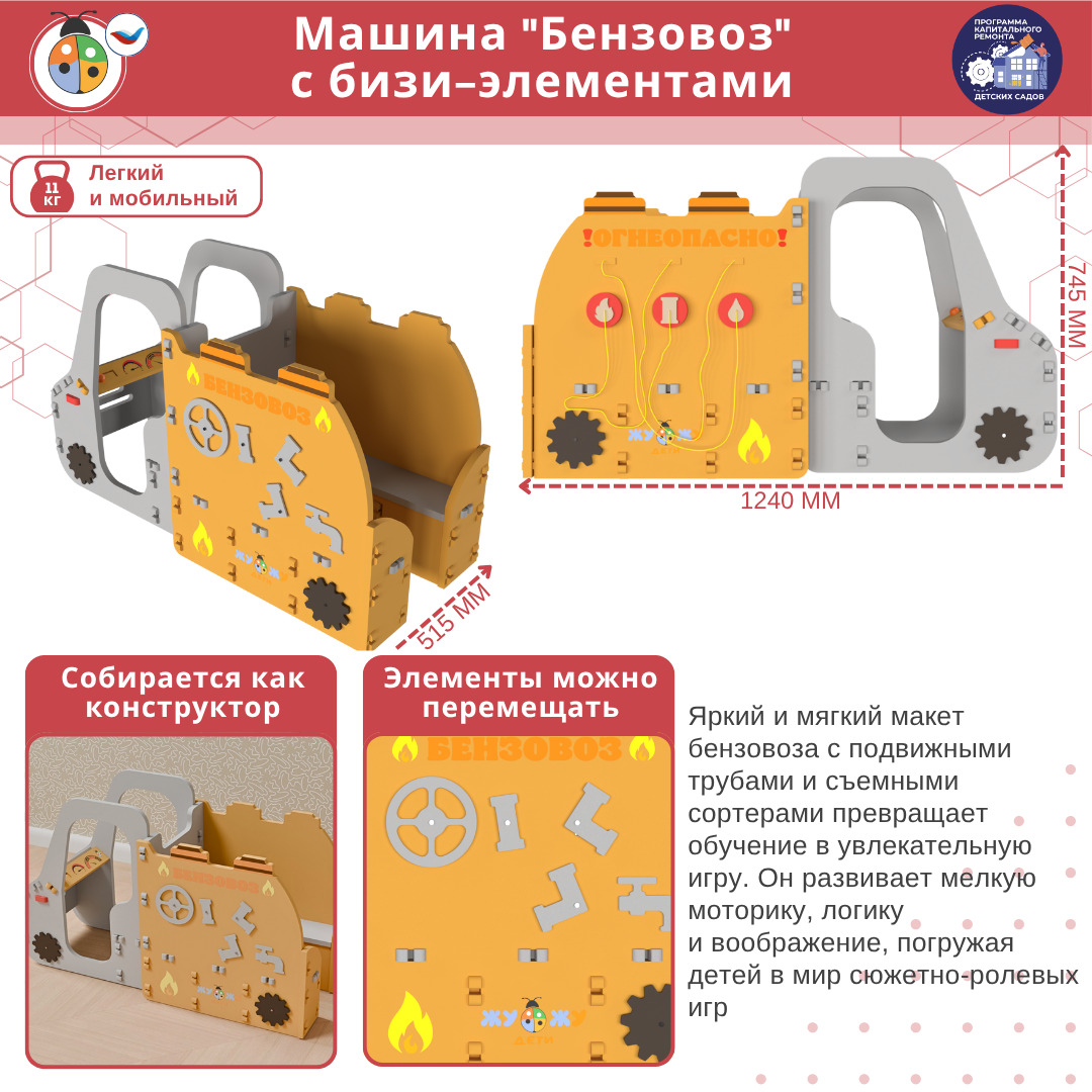 Яркий и безопасный макет бензовоза из мягкого материала с подвижными трубами и съемными сортерами превращает обучение в увлекательную игру, развивая мелкую моторику, логику и воображение у детей! Идеально подходит для детских садов и развивающих центров — реалистичная кабина водителя, пассажирские лавочки и интерактивные элементы надолго увлекают малышей в сюжетно-ролевые игры.