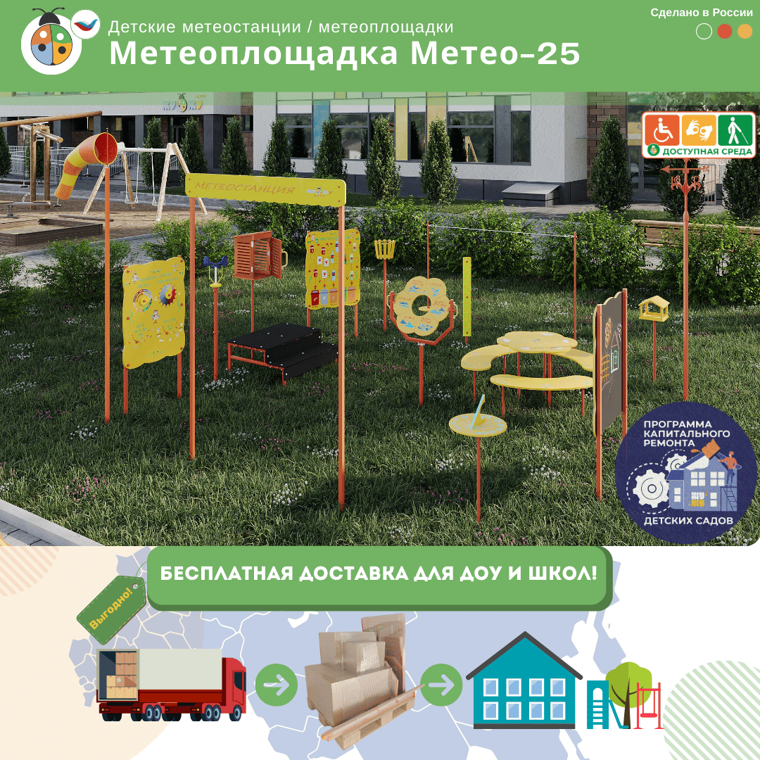 Уличные площадки (метеостанции, музыкальные, патриотические площадки) мы доставляем бесплатно при сумме договора от 150 000 рублей до адреса Покупателя по всей РФ. Остальные индивидуальные комплекты доставляем за счет Покупателя, включая в стоимость договора.