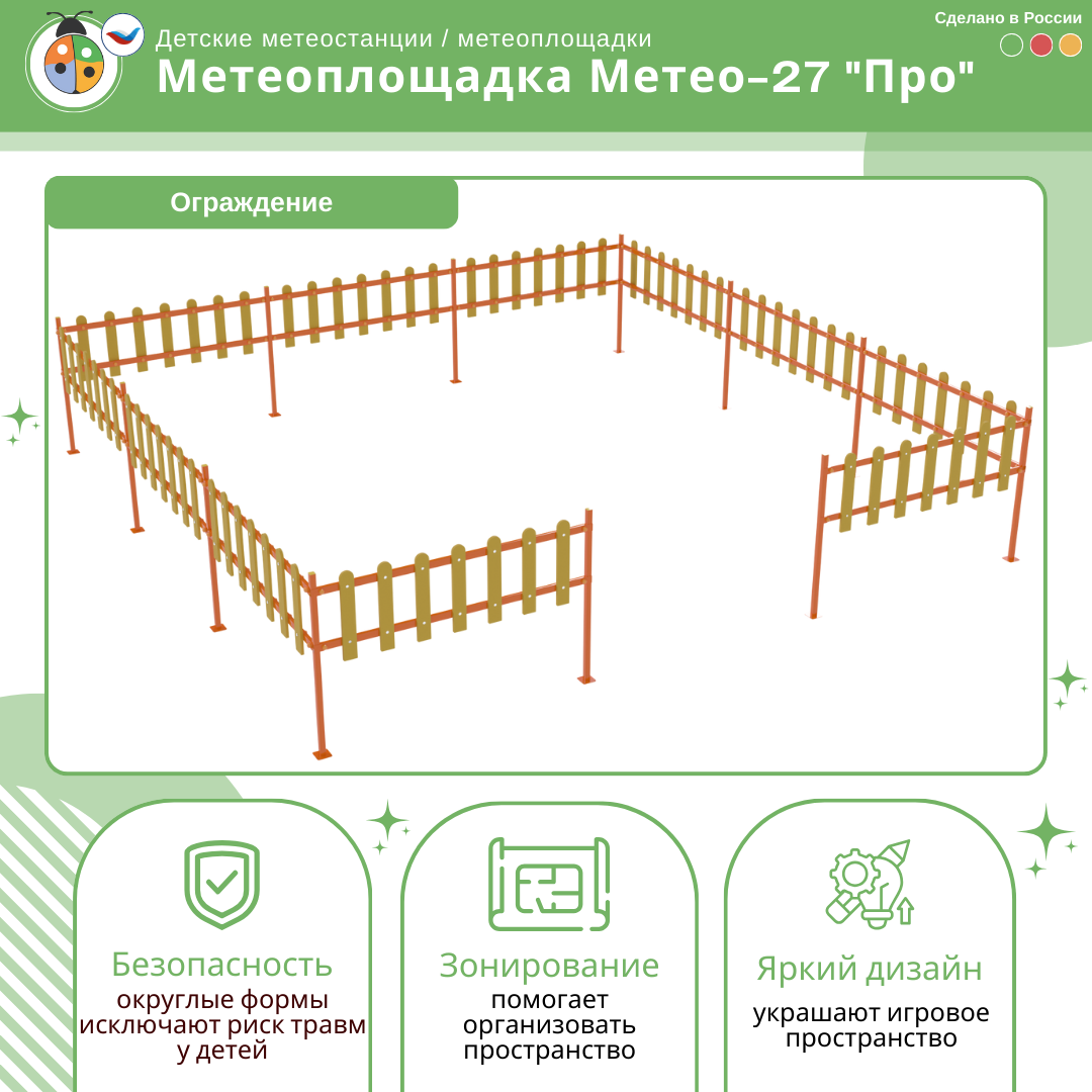 12. Ограждение - отделяет территорию метеоплощадки, с ним метеоплощадка выглядит ещё привлекательнее! Ограждение изготовлено безопасно для детей: отсутствуют острые углы, на крепежных деталях встроены яркие заглушки.