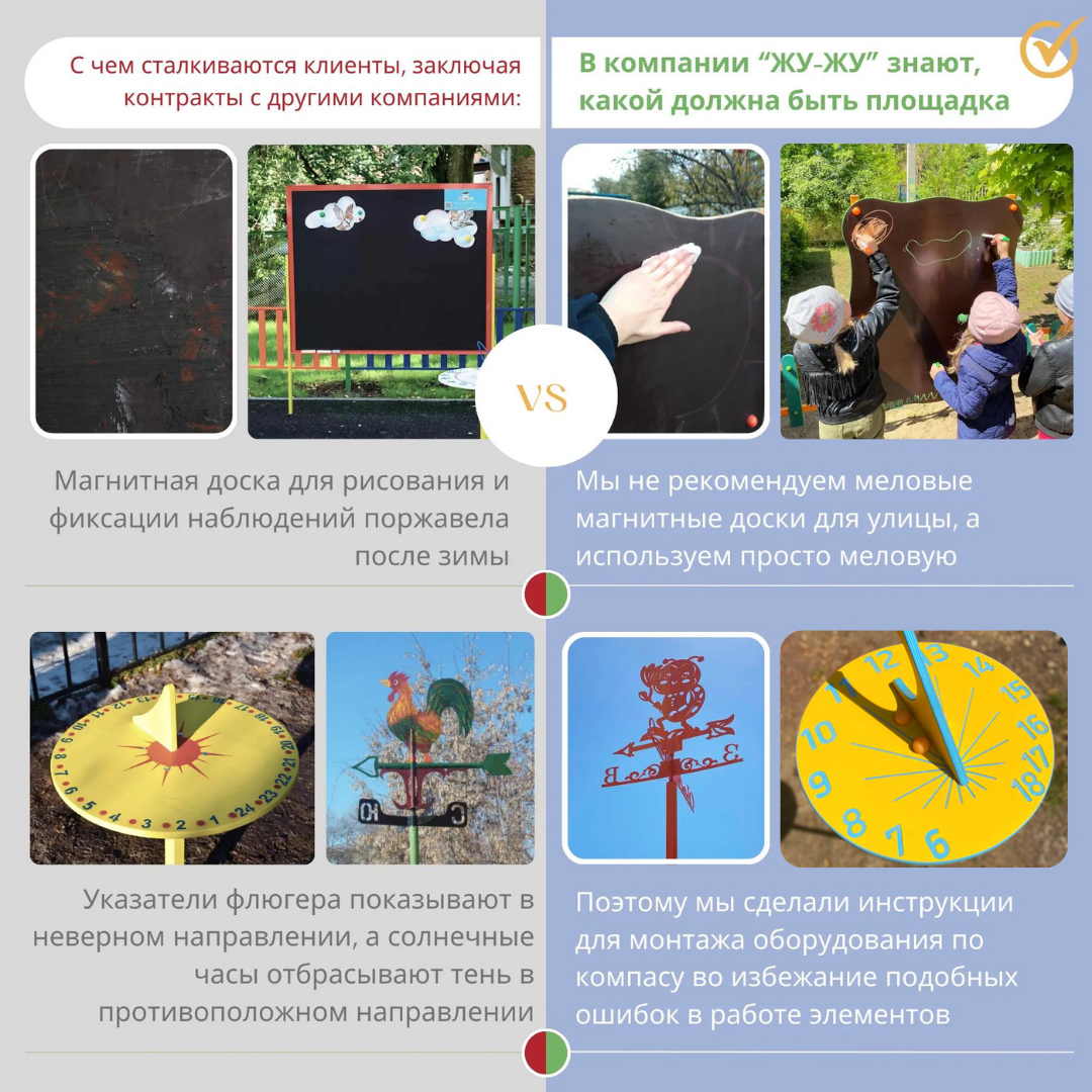- Да, площадка прослужит многие годы! Столбики у элементов не ржавеют, так как на них надеваются заглушки для предотвращения попадания осадков. Все элементы метеостанции выполнены из влагостойкой фанеры ФСФ, ламинированной цветным пластиком, поэтому останутся яркими и гладкими даже спустя несколько лет.