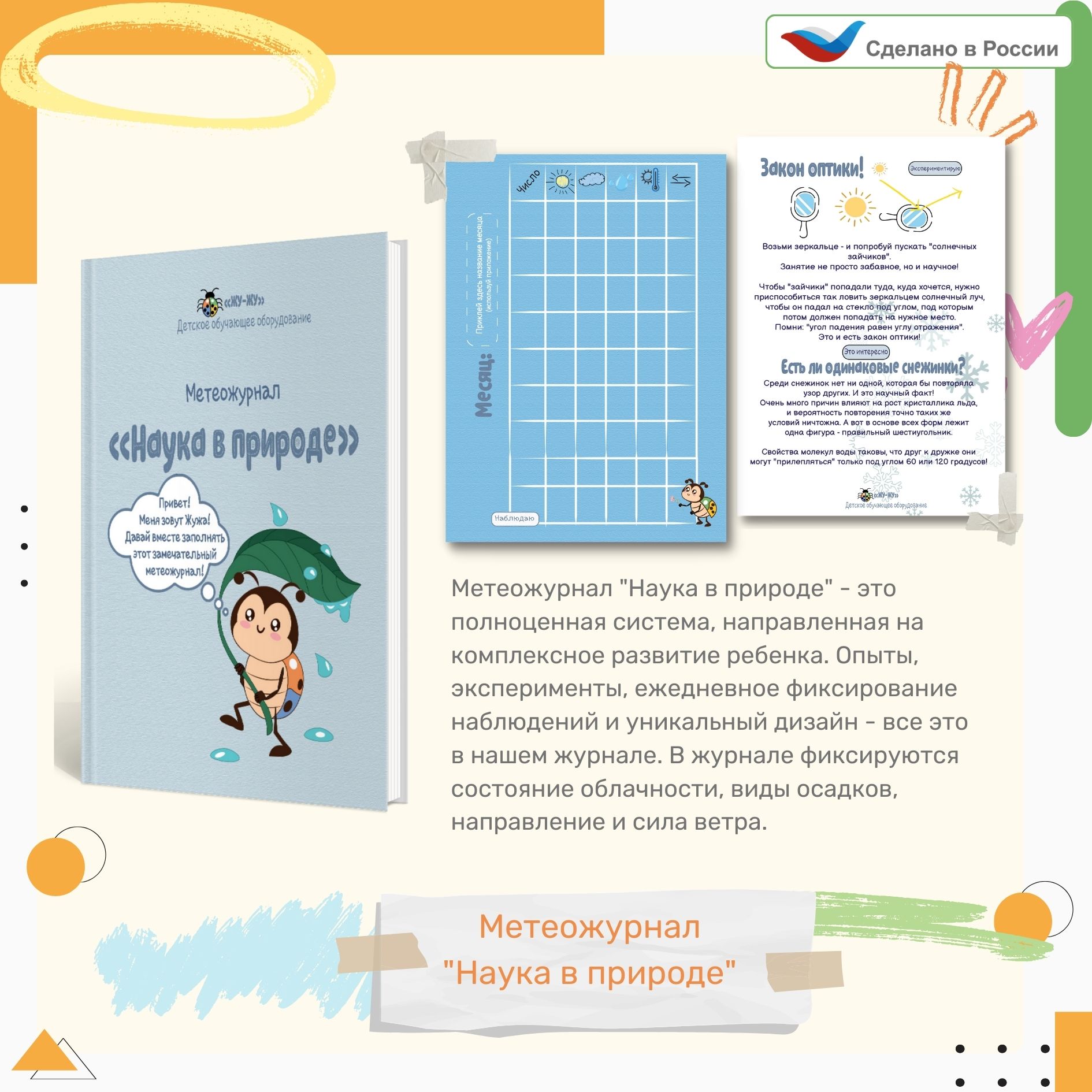 Метеожурнал "Наука в природе" - это полноценная система, направленная на комплексное развитие ребенка. Опыты, эксперименты, ежедневное фиксирование наблюдений и уникальный дизайн - все это в нашем журнале. В журнале фиксируются состояние облачности, виды осадков, направление и сила ветра. Внимание! В связи с политикой защиты от недобросовестной конкуренции, данный товар разрешен к продаже только в составе комплекта, либо при повторном заказе