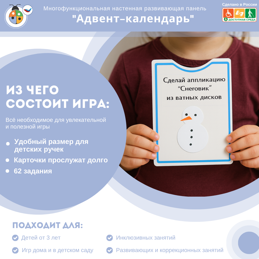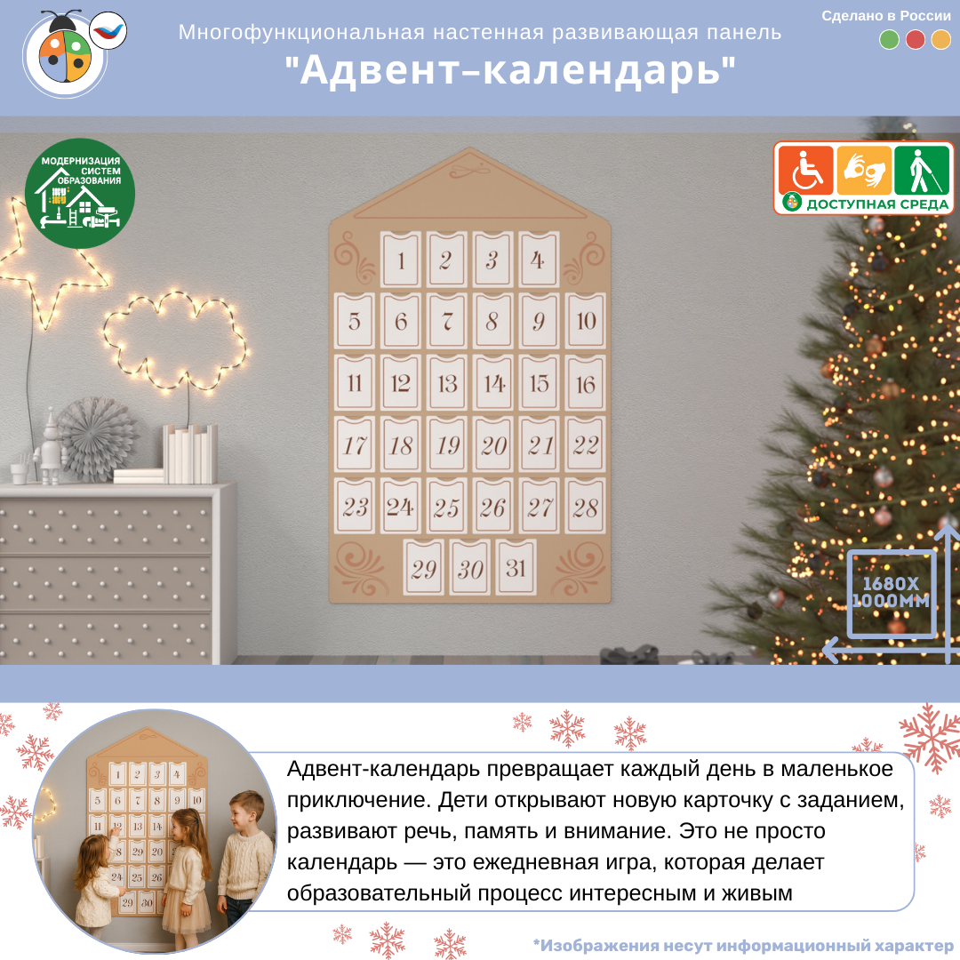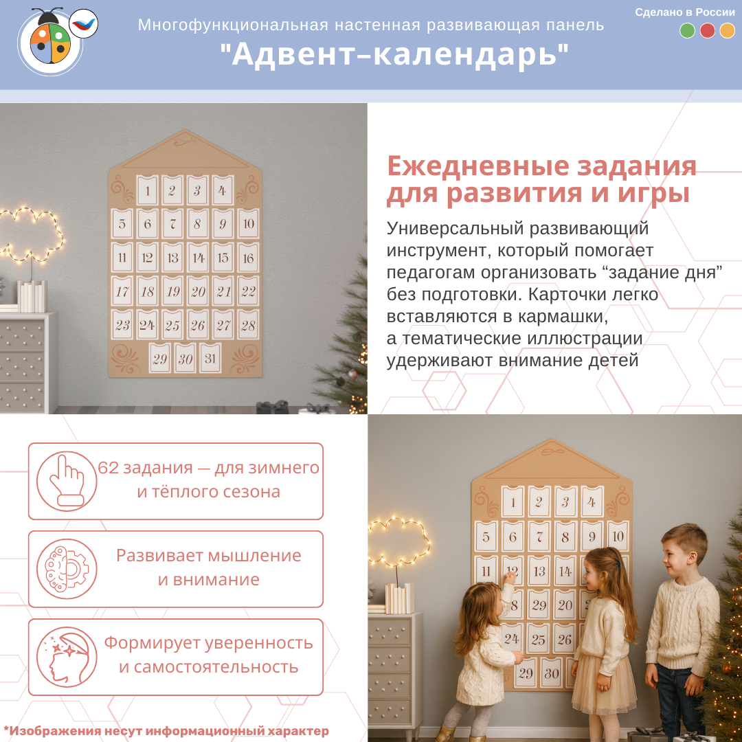 Большой Адвент-календарь — интерактивная развивающая панель, которая превращает каждый день в маленькое открытие. Карточки с заданиями увлекают детей, развивают внимание и делают образовательный процесс увлекательной игрой.