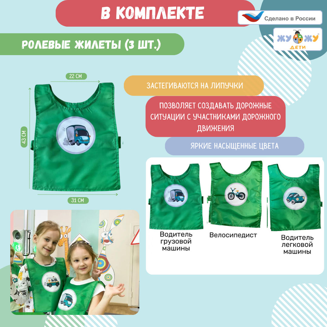3. Жилет детский по ПДД: Водитель грузовой машины - необходим для занятий с автогородком, т.к. позволяет создавать дорожные ситуации с участниками дорожного движения. Жилет имеет яркий и привлекательный дизайн! Удобен для самостоятельного использования детьми, так как застёгивается на липучки.