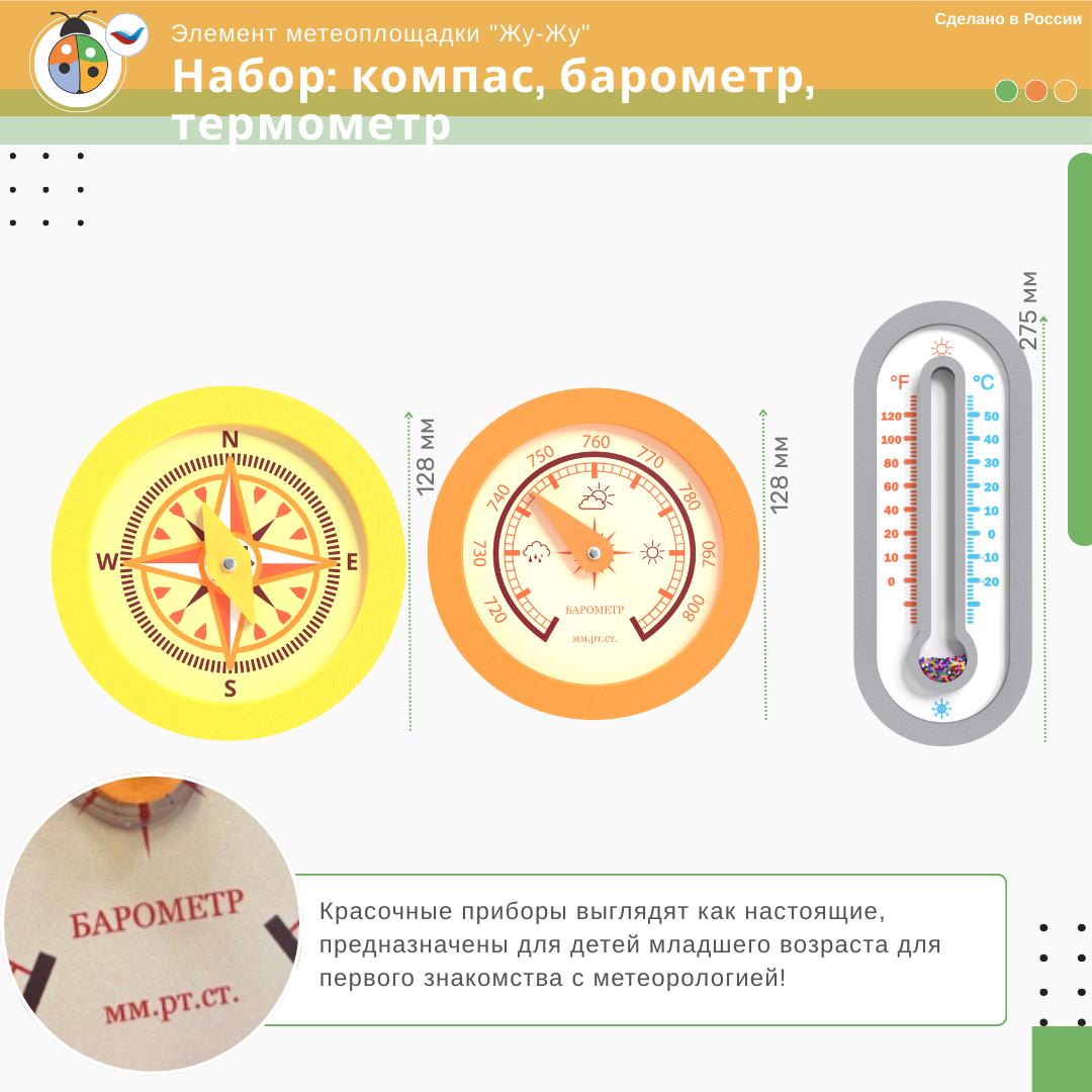 Набор интерактивных игр "Жу-Жу": компас, барометр, термометр — это увлекательное знакомство с миром метеорологии: яркие, безопасные приборы помогут малышам понять принцип работы компаса, термометра и барометра в игровой форме.