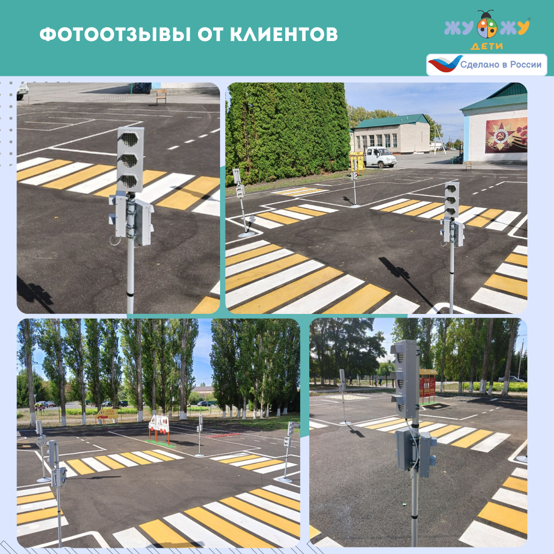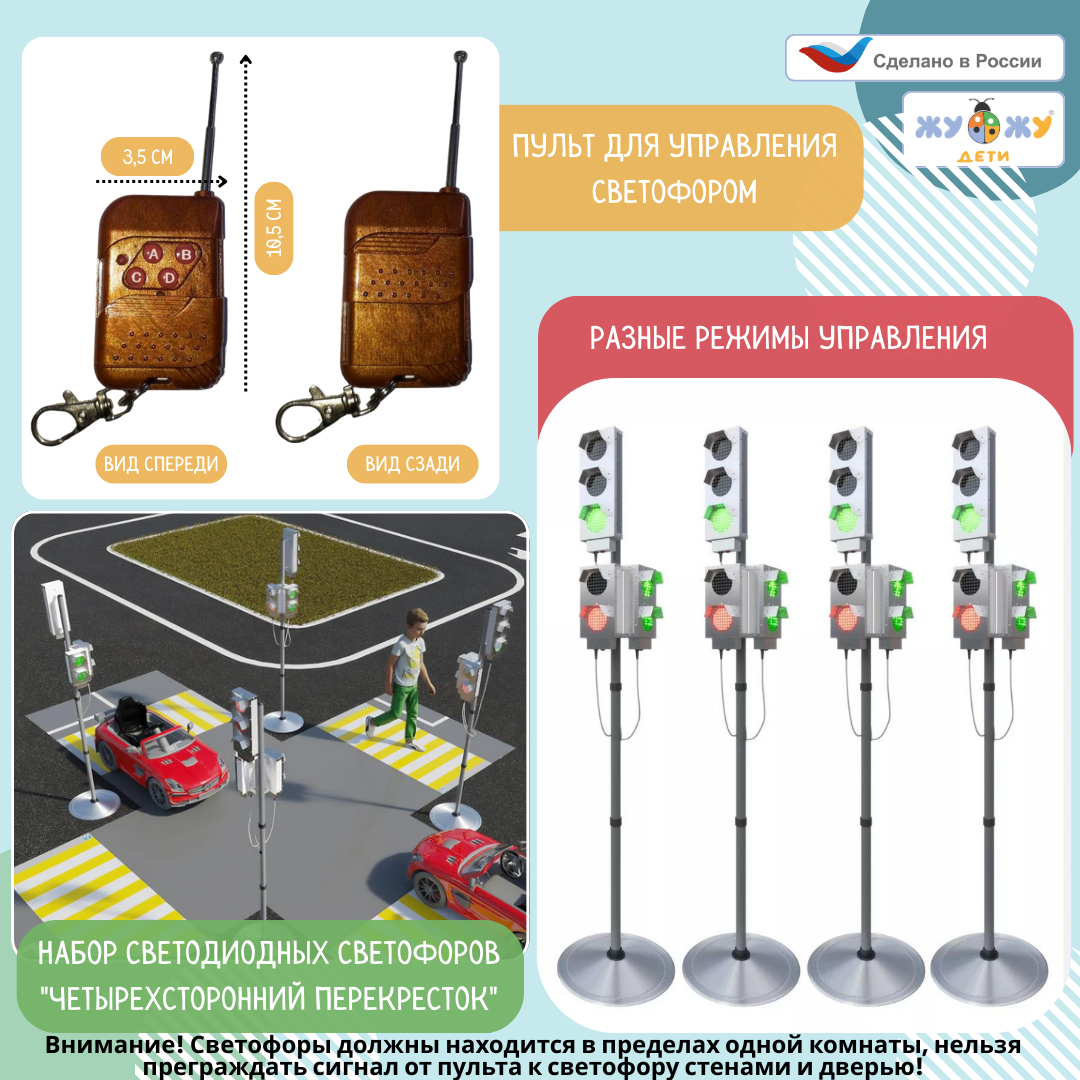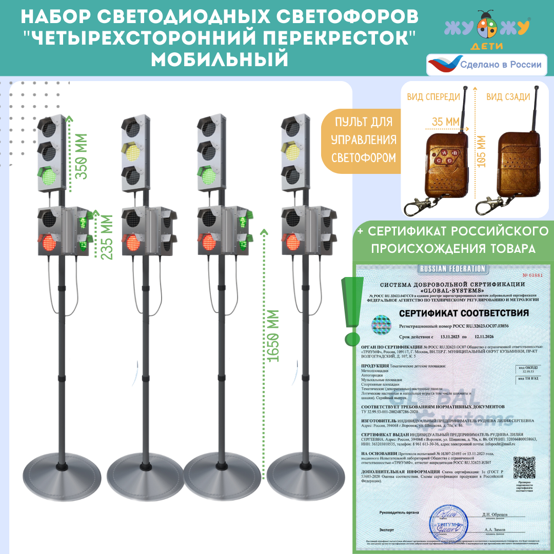 Комплект из 12 светофоров светодиодных, связанных программой управления в 3 режимах работы, выводимых на пульт дистанционного управления, функционирующих без подключения к 220 V.