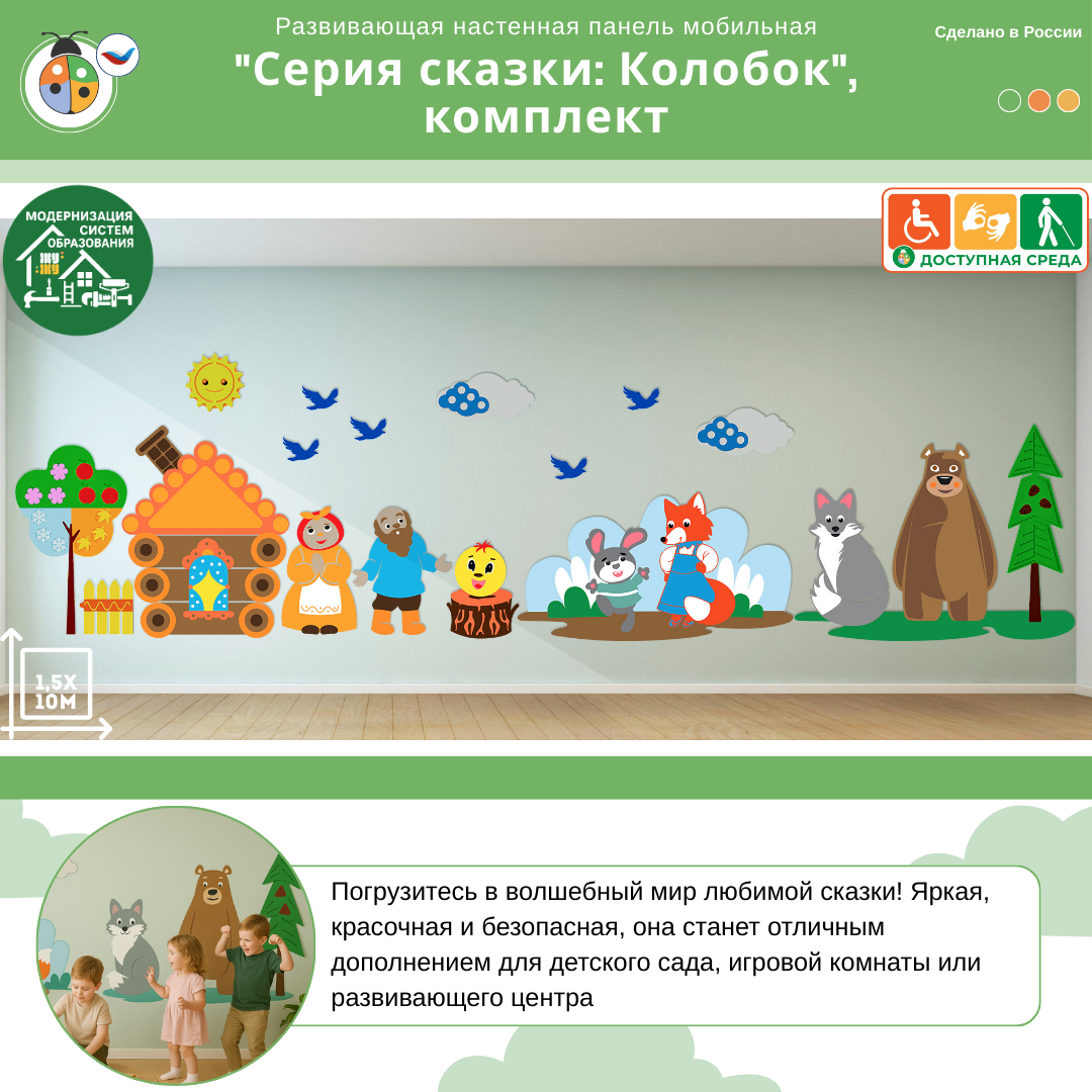 Яркая и красочная настенная панель "Колобок" – идеальное решение для зонирования пространства и оформления групп в детских дошкольных учреждениях. Этот замечательный элемент декора поможет познакомить детей с русскими сказками и украсить помещение. Яркие образы героев сказки "Колобок" привлекают внимание и вызывают интерес у малышей.