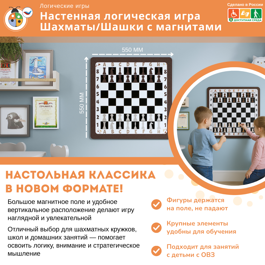 Настенные шахматы и шашки идеально демонстрируют ход игры, поэтому их удобно использовать в обучении игре в шахматы и шашки. Подходят для шахматных кружков, школ, спортивных секций. Игра развивает логику, концентрацию, память, внимание.