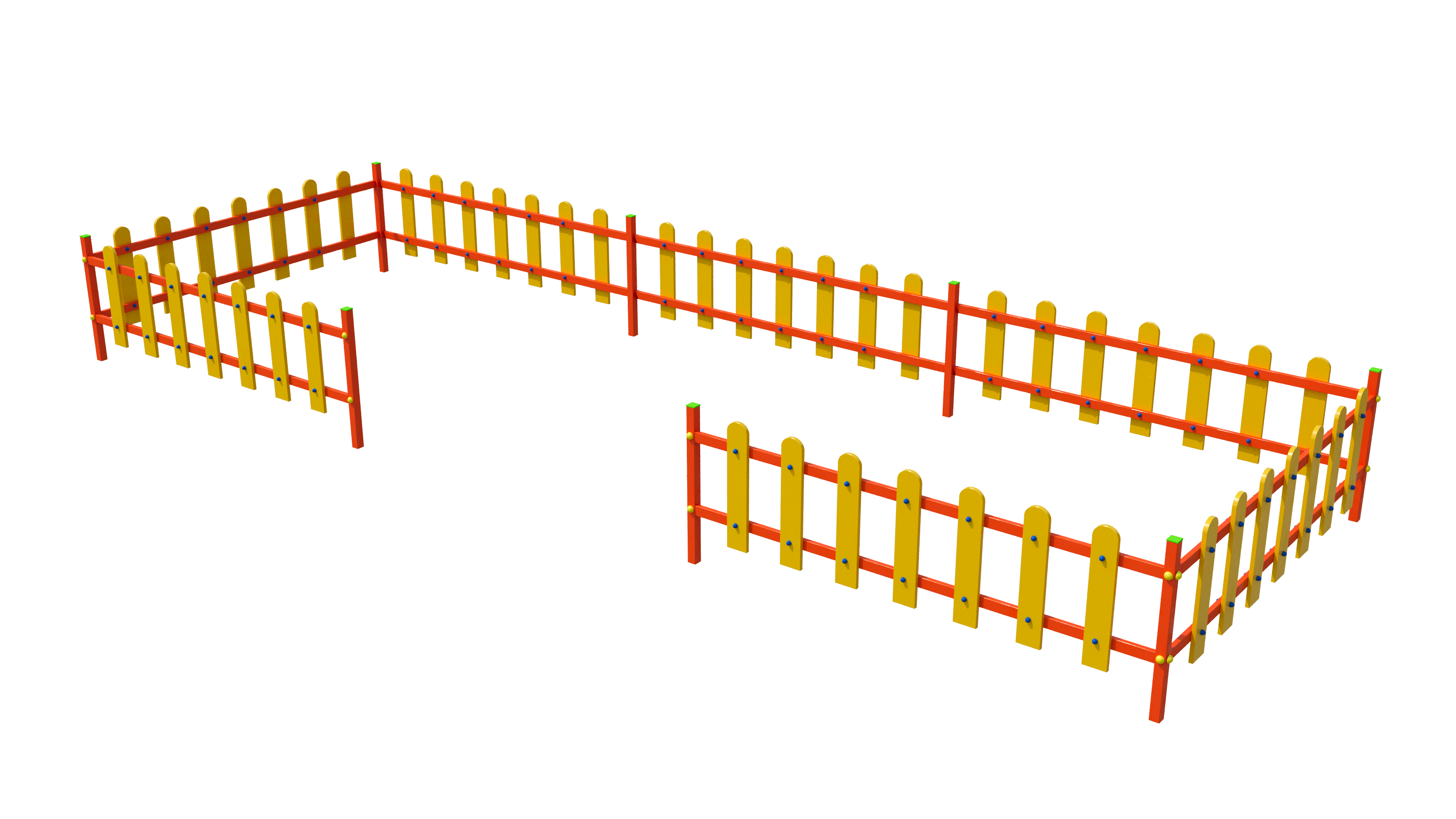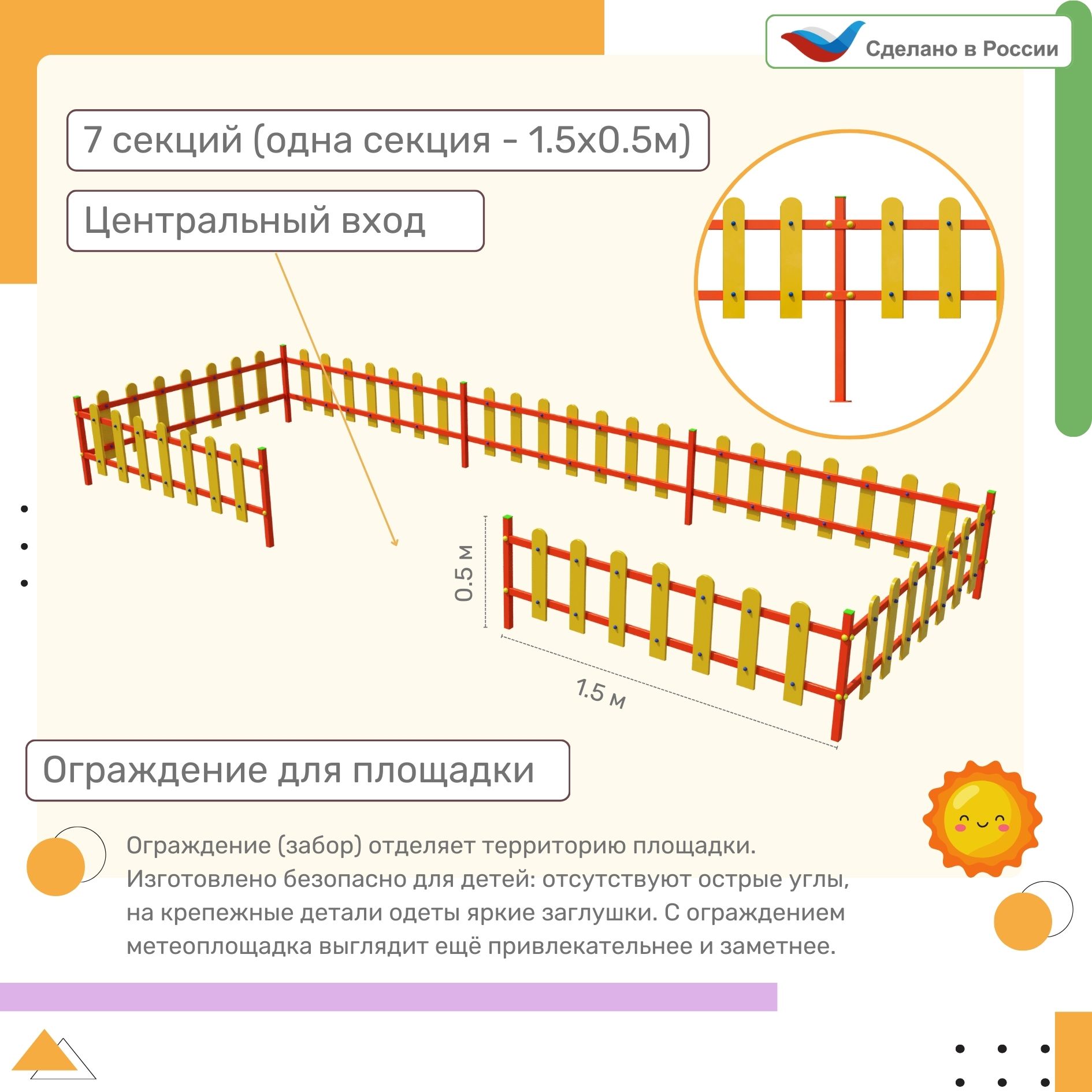 Ограждение (забор) отделяет территорию площадки. Изготовлено безопасно для детей: отсутствуют острые углы, на крепежные детали одеты яркие заглушки. С ограждением метеоплощадка выглядит ещё привлекательнее и заметнее.