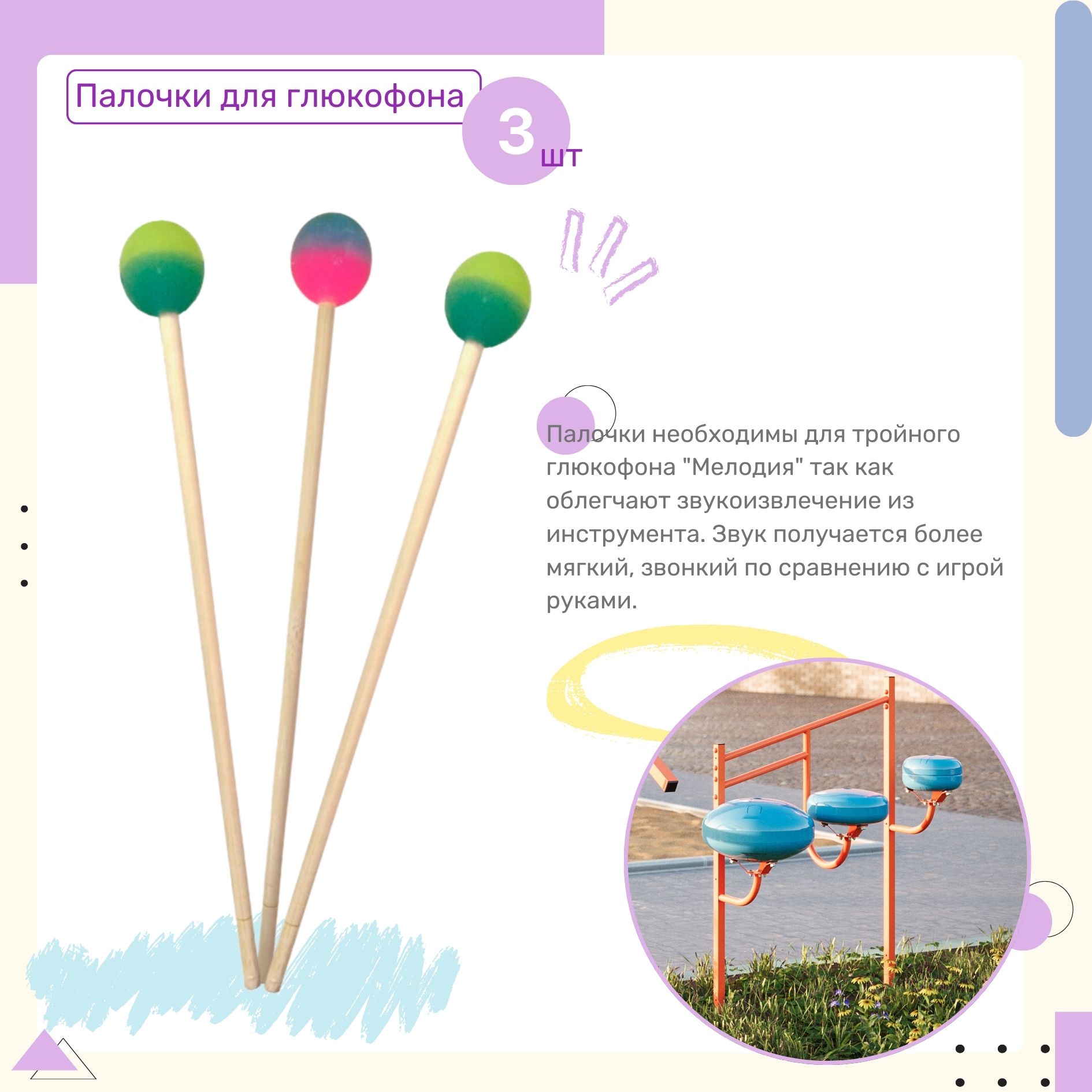 Палочки предназначены для игры на: элементе музыкальной площадки "Этюд" - вертикальный металлофон, элементе музыкальной площадки "Ритмика" - барабанная установка, элементе музыкальной площадки "Мелодия" - тройной глюкофон, элементе музыкальной площадки "Звонкая капель", элемент музыкальной площадки "Веселая лесенка" - металлофон.