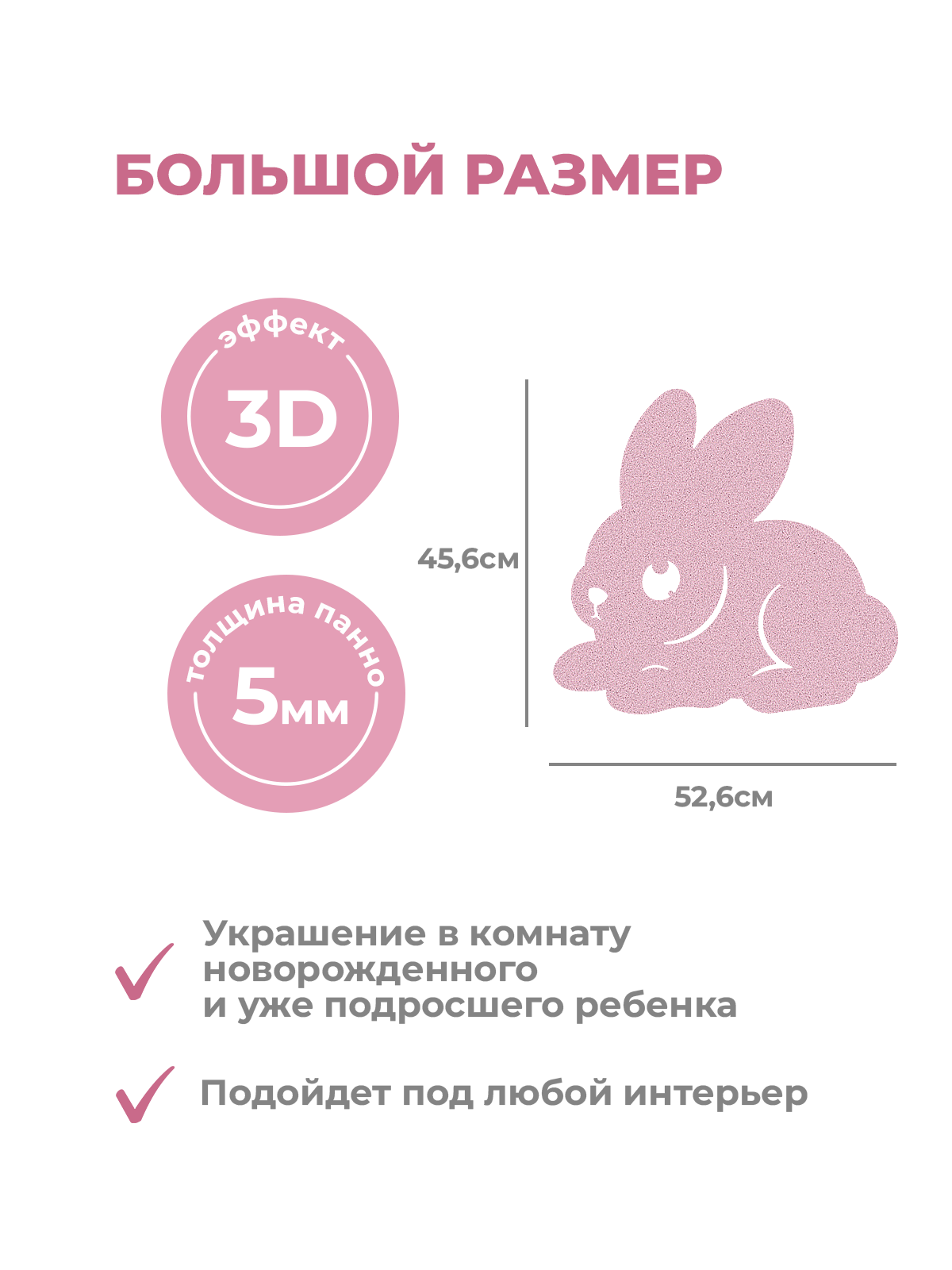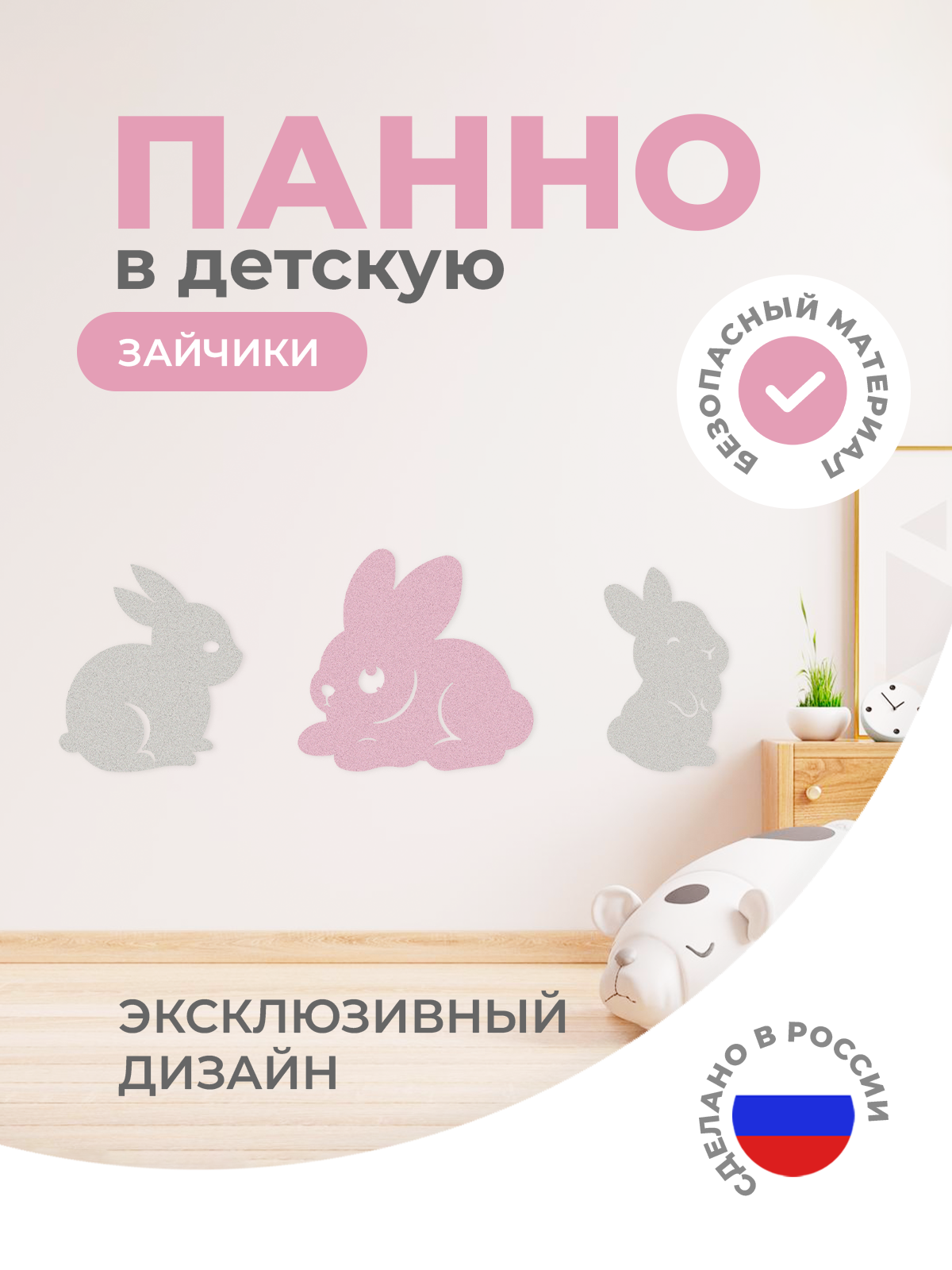 Настенная панель «Зайчики» в нежном сочетании серого и розового цветов создаёт трогательный и уютный акцент для детской или игровой комнаты, изображая милых зайчат в лаконичном современном стиле.
