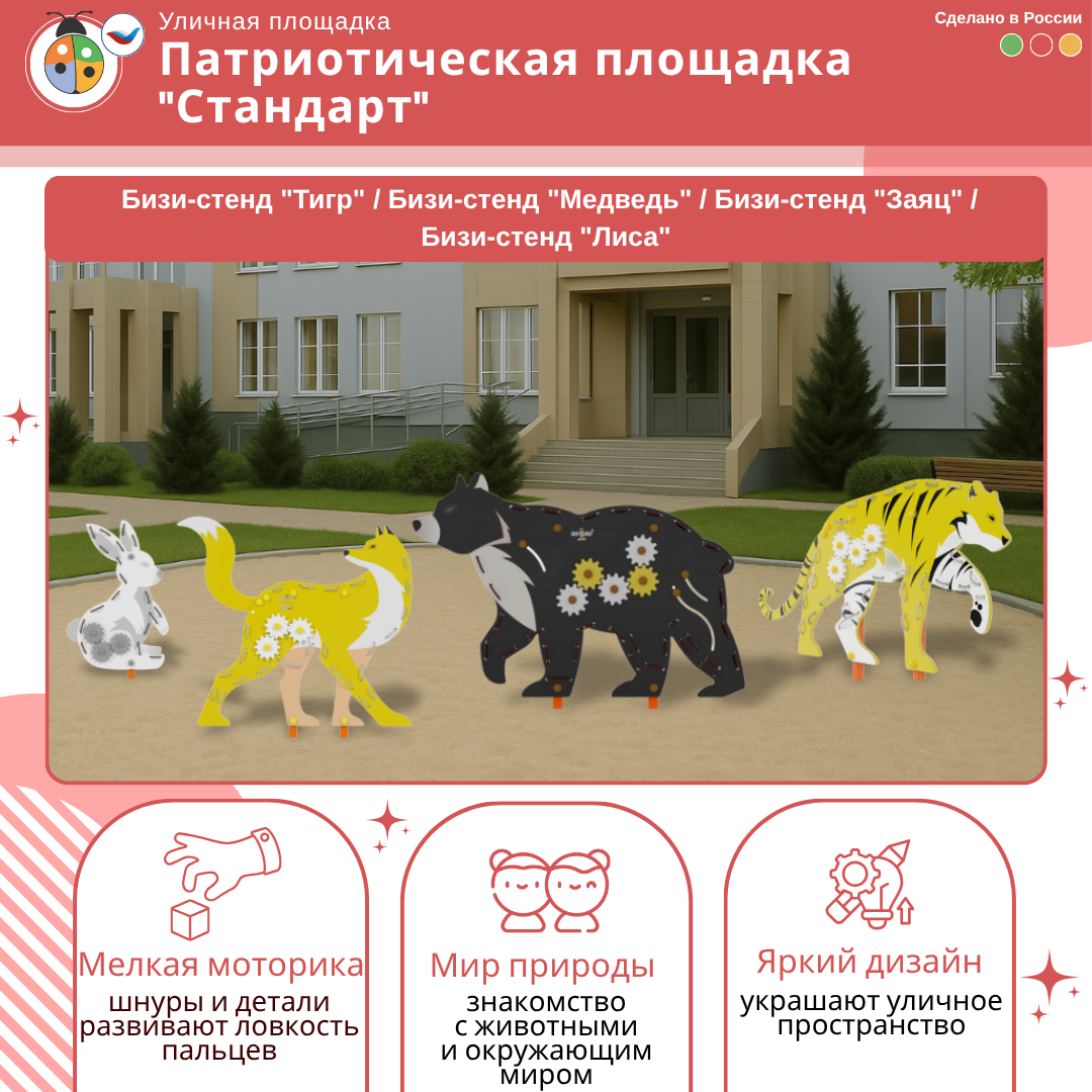 9. Бизи-стенд "Медведь" декоративно-развивающий - развивает моторику рук у детей, украшает собой площадку. Элемент патриотической площадки "Медведь" изображает эндемичный для территории РФ вид животного.