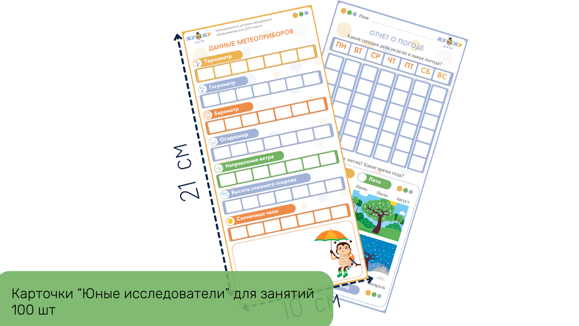 11. Карточки “Юные исследователи” для занятий 100 шт - используются для фиксирования результатов измерения с приборов метеоплощадки, позволяют отслеживать изменения погодных условий. Формат: А5.