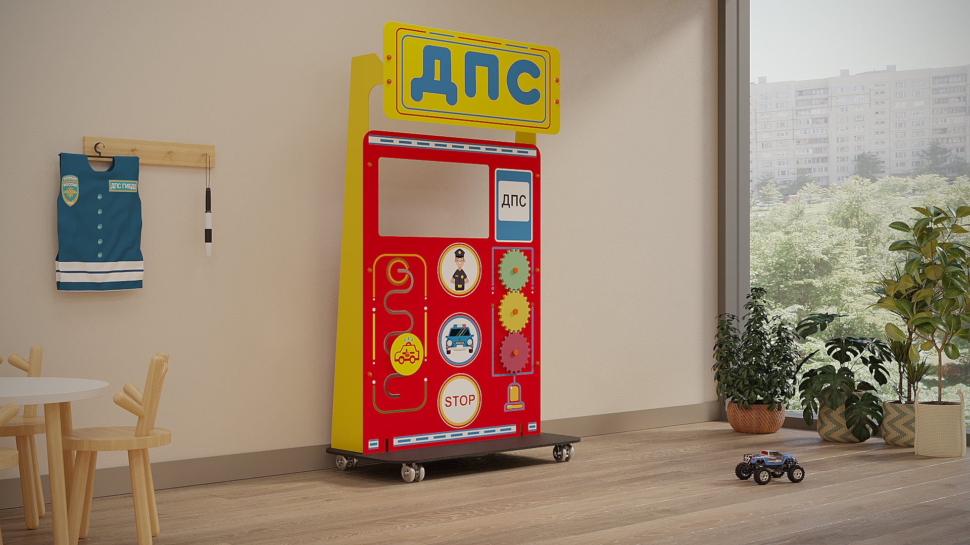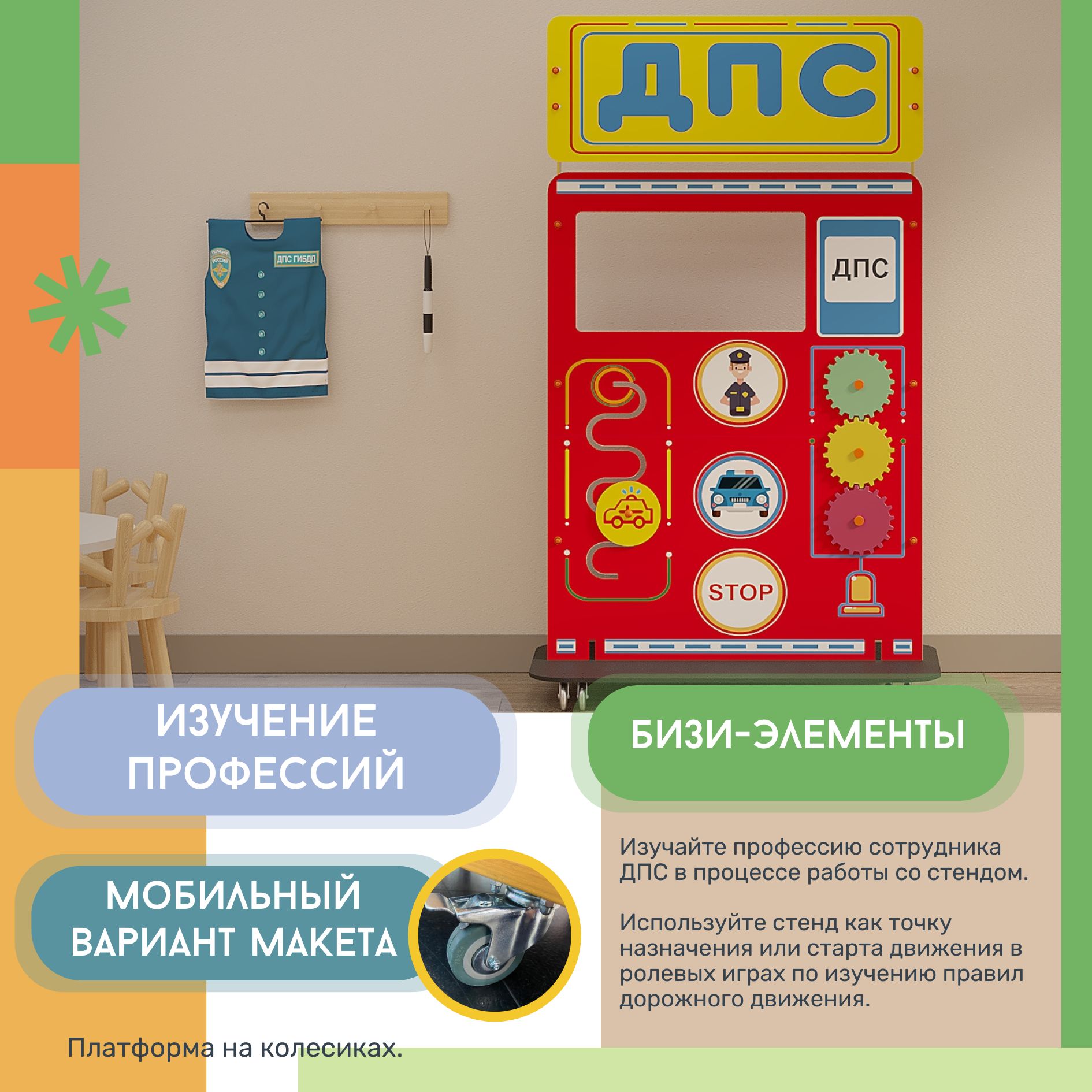 С мобильным комплектом профессии "Сотрудник ДПС" дети познакомятся с основами работы этой специальности. Игра с комплектом развивают моторику, память, воображение и умение строить причинно-следственные связи!