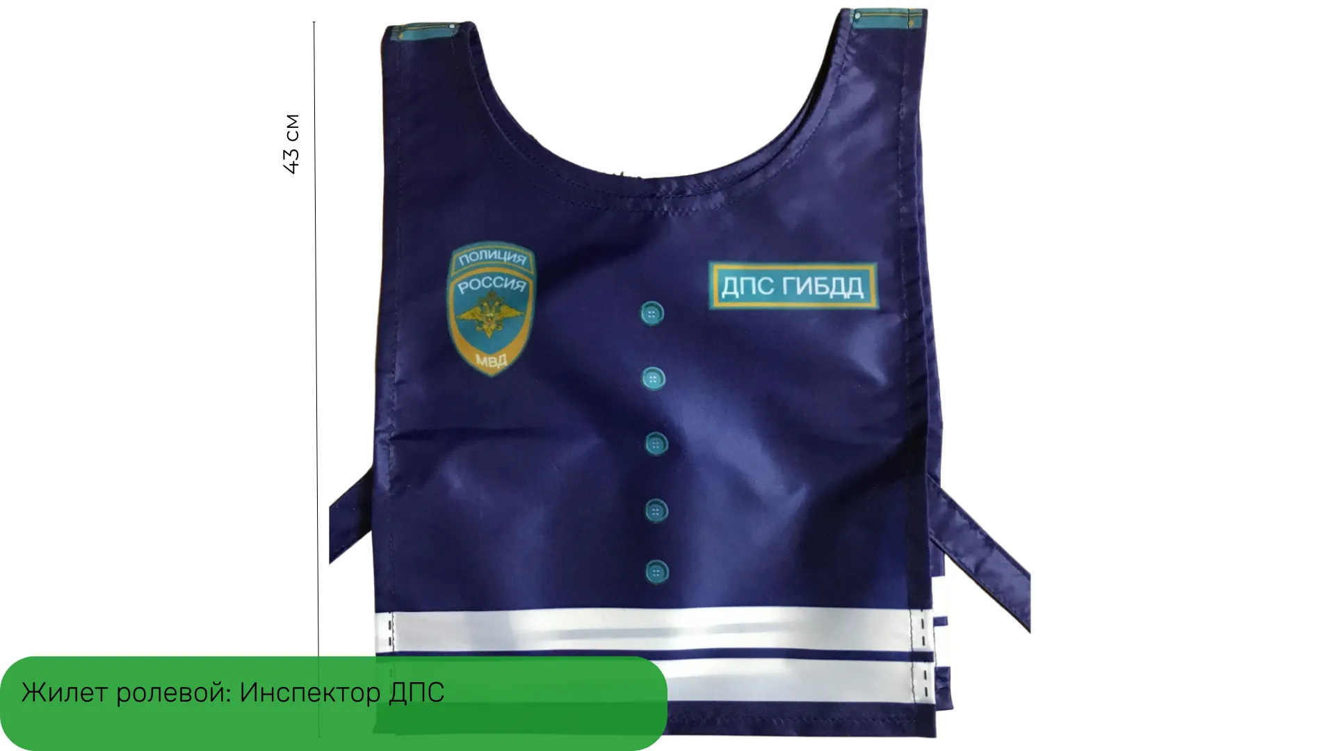 1. Жилет ролевой: Инспектор ДПС - 1 шт - предназначен для знакомства детей с профессией инспектора ДПС и создания дорожных ситуаций. Цвет жилета как у формы настоящего инспектора!