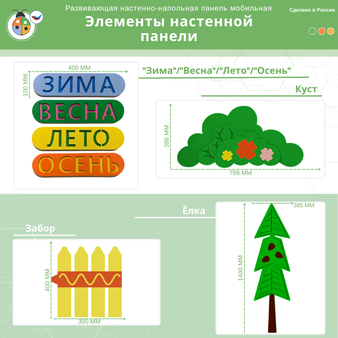 Игровая настенная панель предназначена для зонирования пространства и оформления групп в ДОО или специализированных детских учреждениях. На панели расположены съемные элементы, кармашки для методических материалов, пальчиковый лабиринт. Игра с настенной панелью развивает мелкую моторику, знакомит с особенностями времен года.